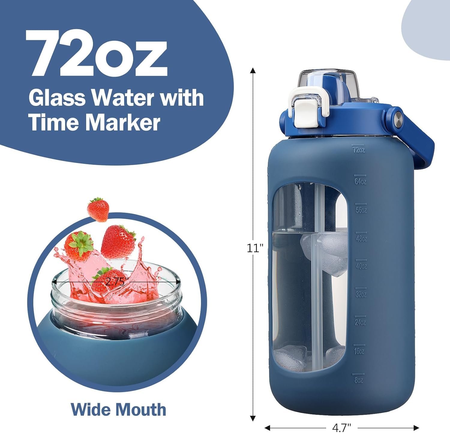 【Premium Borosilicate Glass】This 72oz water bottle is made of borosilicate glass, making it BPA-free, more durable, and healthier. With a 2.76In wide mouth, the large opening not only makes cleaning a breeze but also allows you to easily add ice cubes or fruit.