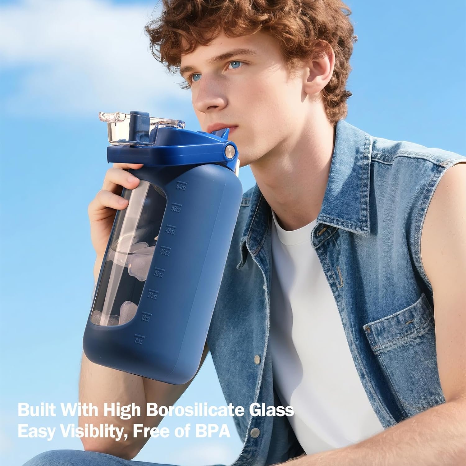 72oz Glass Water Bolttles, 3-in-1 Straw and Sip Spout Handle Lid, Half Gallon Water Bottle with Time Marker and Silicone Sleeve, BPA-Free Sports Water Bottle for Gym, School, DBlue