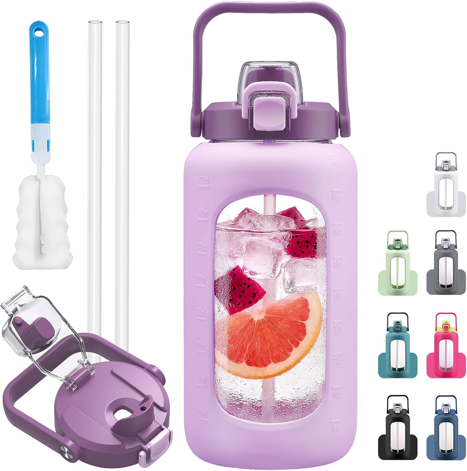 72oz Glass Water Bolttles, 3-in-1 Straw and Sip Spout Handle Lid, Half Gallon Water Bottle with Time Marker and Silicone Sleeve, BPA-Free Sports Water Bottle for Gym, School, Lilac
