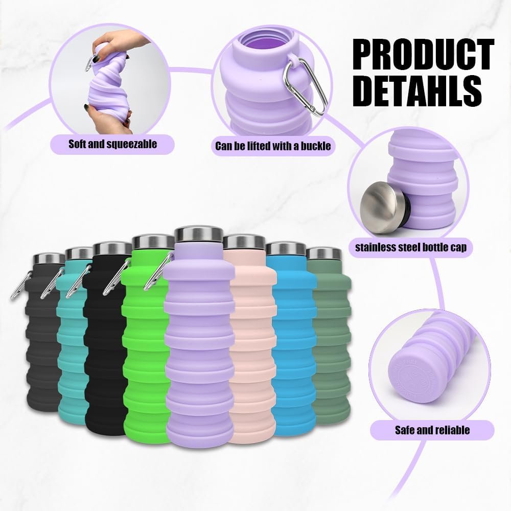 8 Pcs Collapsible Water Bottles, Reusable Silicone Foldable Sports Bottle 17 oz, Portable Lightweight with Carabiner for Gym, Hiking, Camping, Travel in Fresh Colors