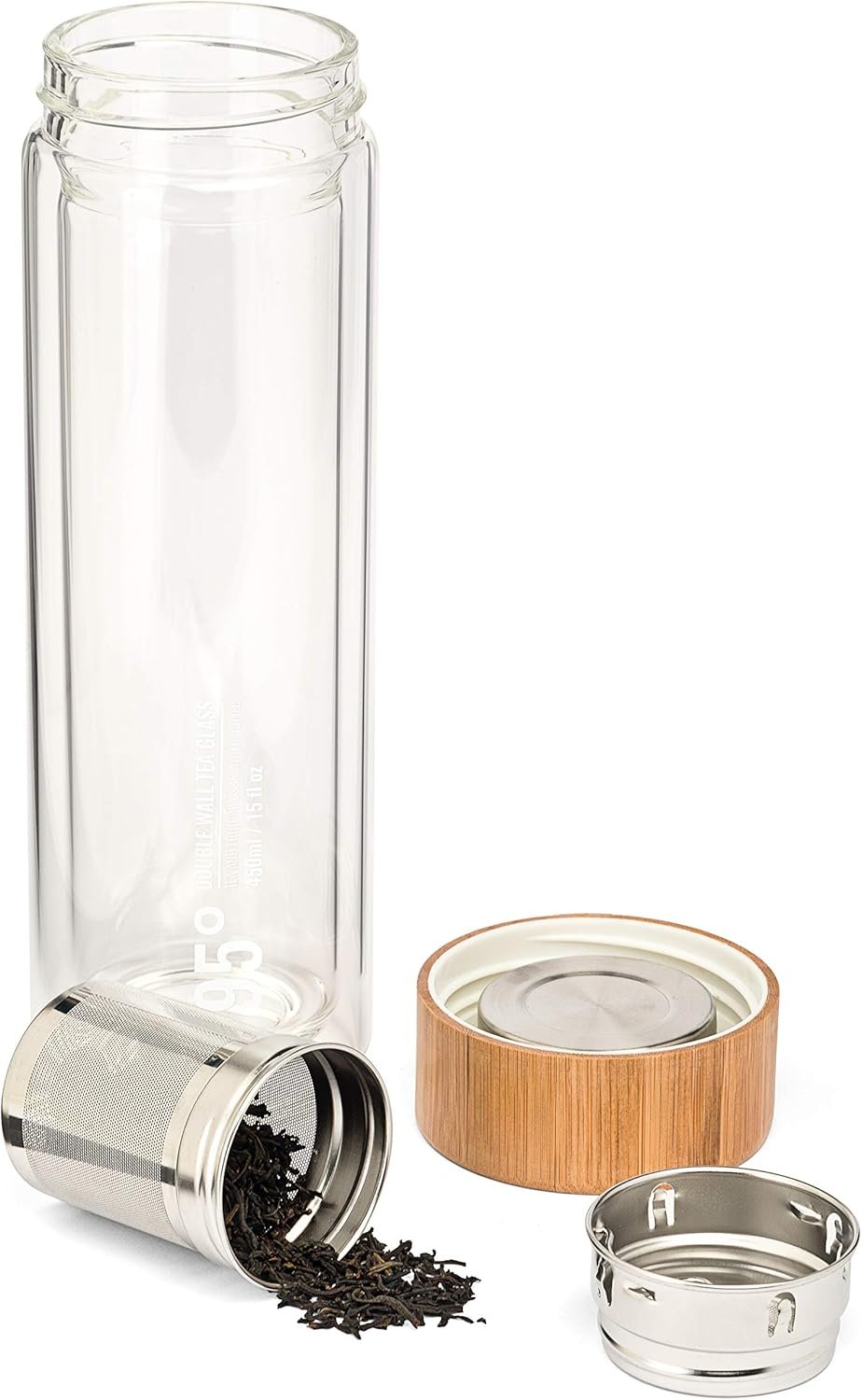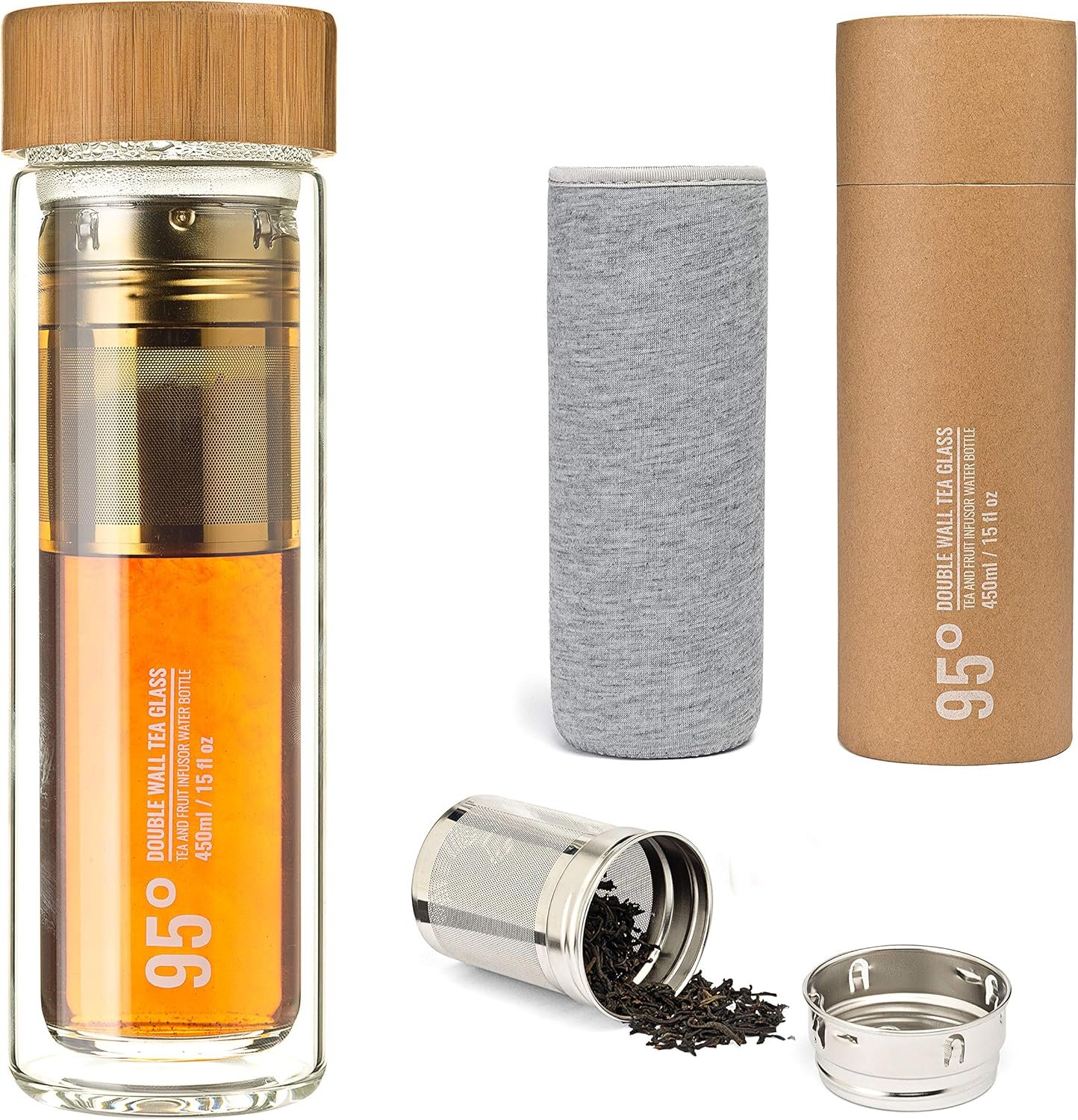 95° Double-Wall Glass Tea Bottle with Removable Stainless Steel Infuser – BPA and BPS Free, Insulated and Leakproof Travel Tumbler for Loose Leaf Tea, Coffee, Fruit – Eco-Friendly (15oz/450ml)