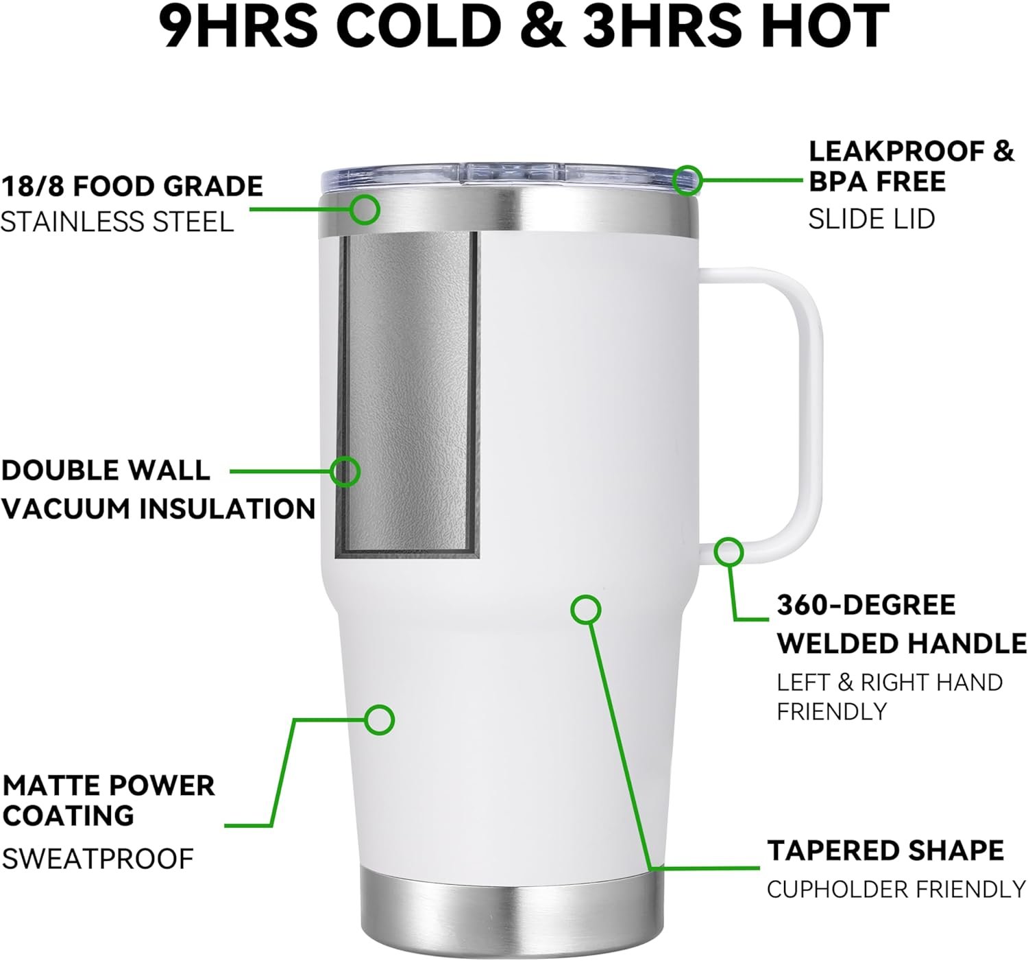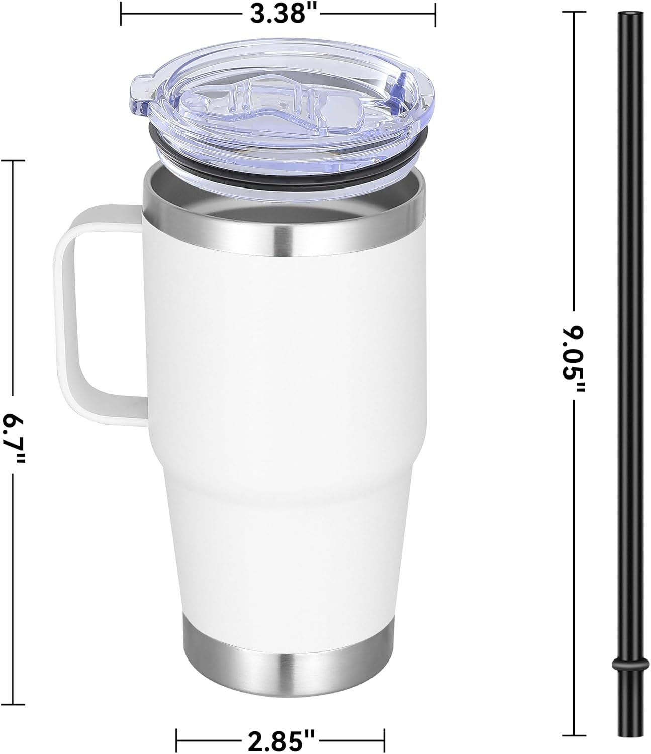 High Quality And Easy To Hold: The 20 oz travel coffee mug is made of thickened 304 18/8 stainless steel. Electro polished inside make you every sip of water pure and sweet. Matte powder coating outside is sweatproof. Equipped with a sturdy 360°welded handle let you easy to hold the coffee travel tumbler