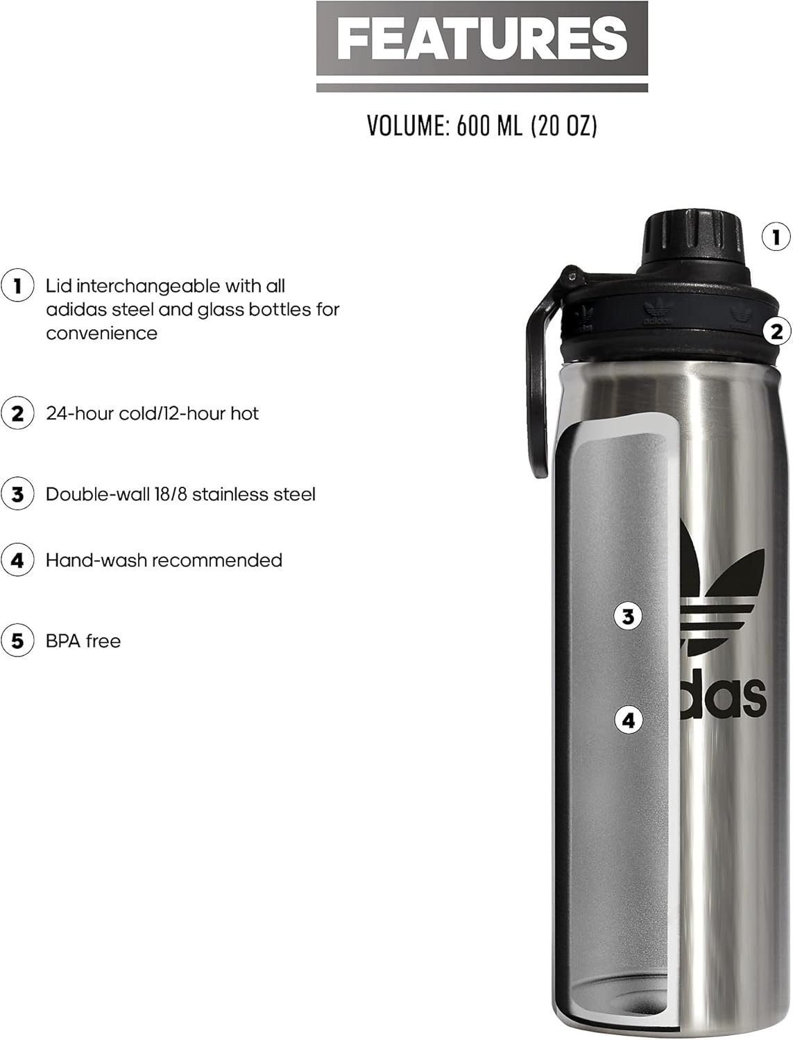 adidas Originals 600 ML (20 oz) Metal Water Bottle, Hot/Cold Double-Walled Insulated 18/8 Stainless Steel