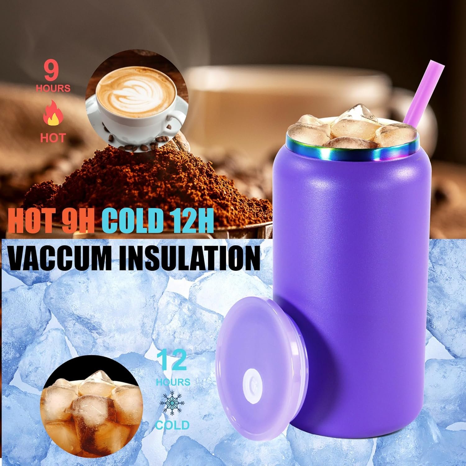 【12 Hours Constant Temperature】AGH Stainless Steel Can Tumbler use double wall vacuum insulation technology to ensure that your cold coffee, coke, juice, beer, after a few hours of time still see the ice, coffee brewed in the morning is still boiling hot at noon Attention:Keep hot for nine hours, cool for 12 hours
