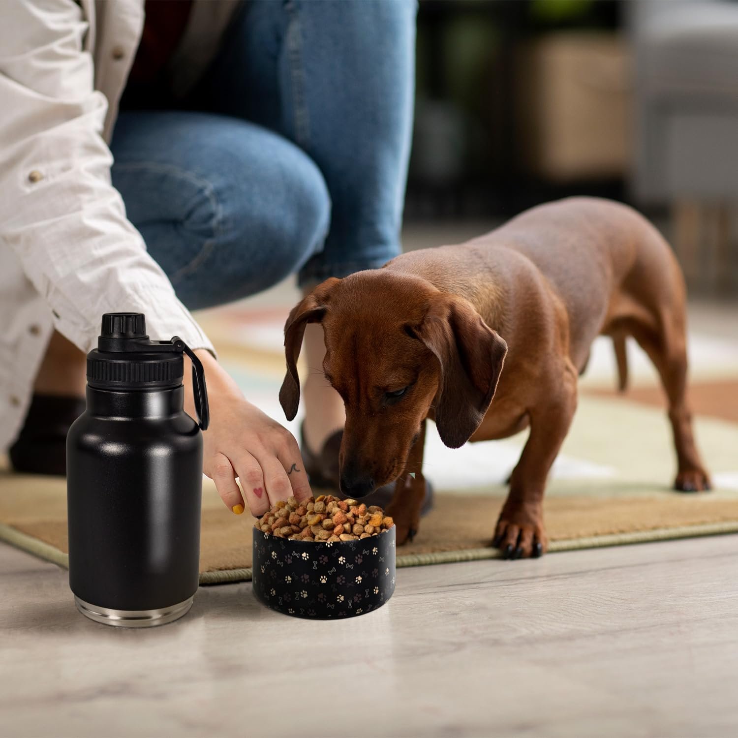 🐾 STYLISH Dog Paws DESIGN: The powder-coated exterior finish gives the bottle a durable and elegant look, making the pet water bottle dispenser perfect for any adventure with your dog. No matter where you place this puppy bowl in your home, it will bring joy and warmth to you and your pet.
