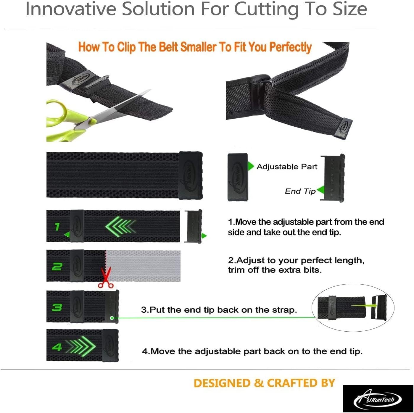 ANTI-SLIP TECHNOLOGY FOR ULTIMATE FIT AND FRICTION-FREE COMFORT : AiRunTech Upgraded run belt hook&loop tape’s in place nicely and doesn’t loosen while running, give you the ultimate freedom of movement and comfort, personalized fit for hips from 18-51.2 inch (46cm-130cm), Designed to be worn low down on the hips, contoured grips ensure total comfort by removing friction, allows for a snug fit that stays in place without bouncing or chafing during use.
