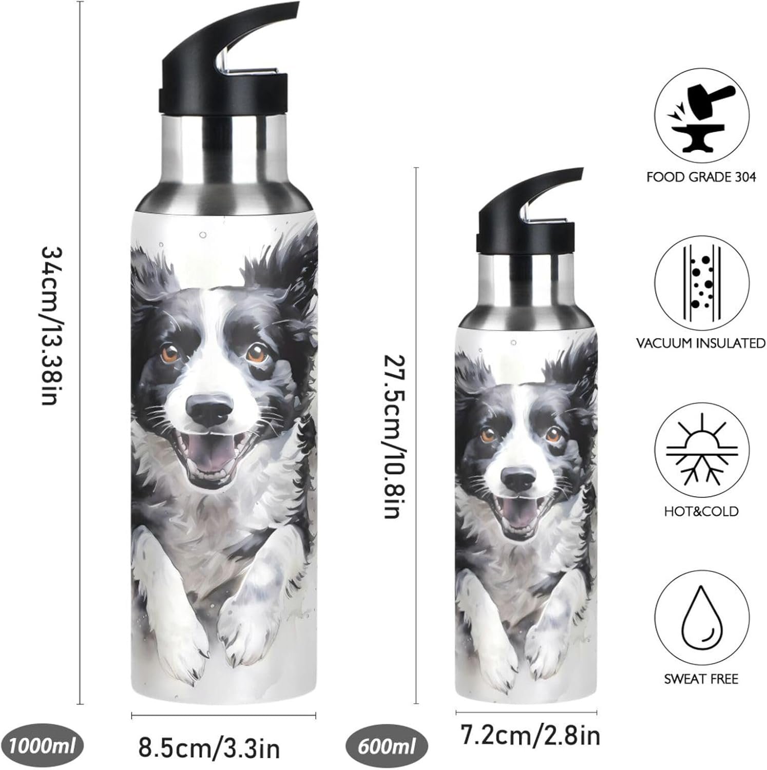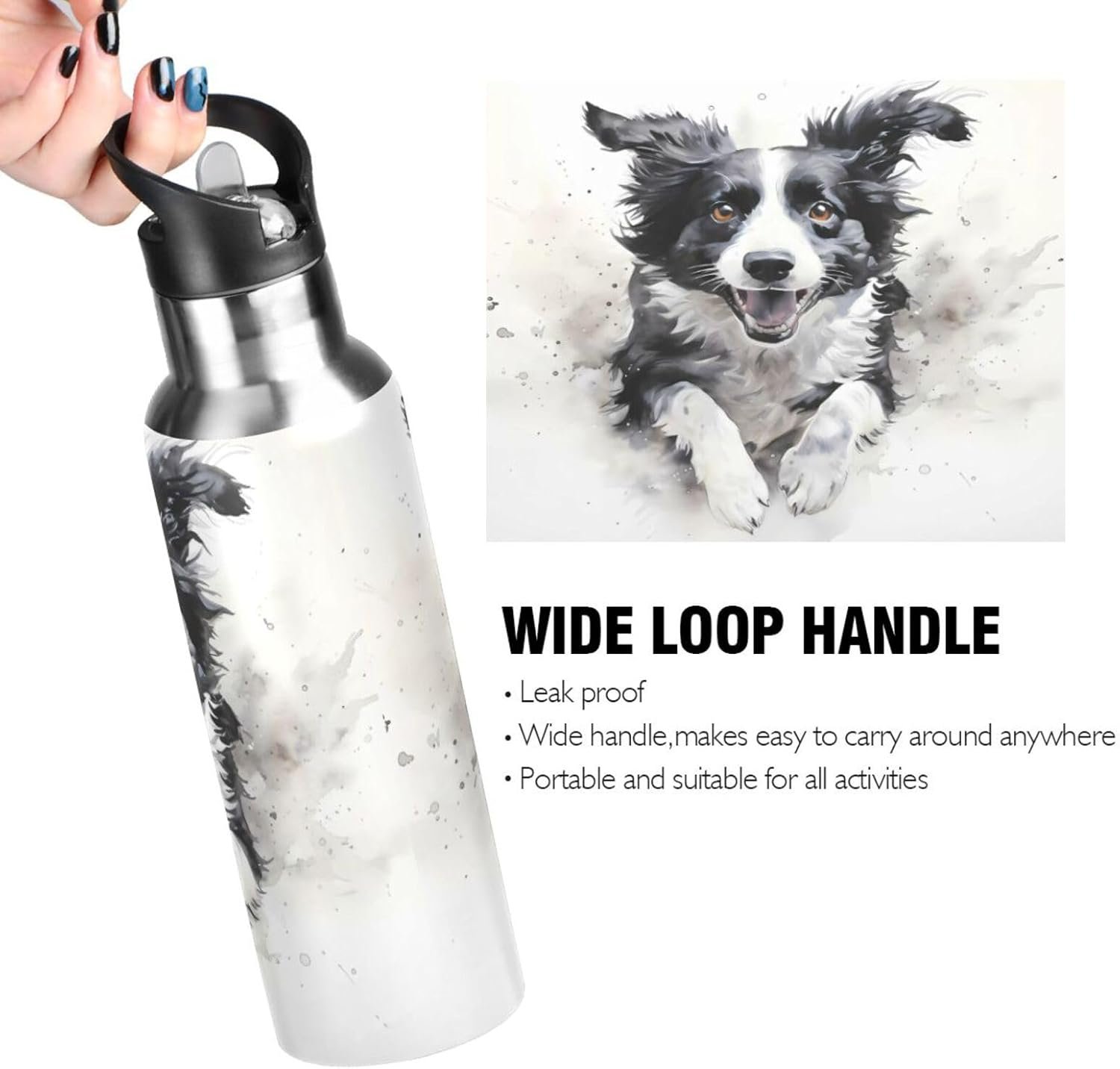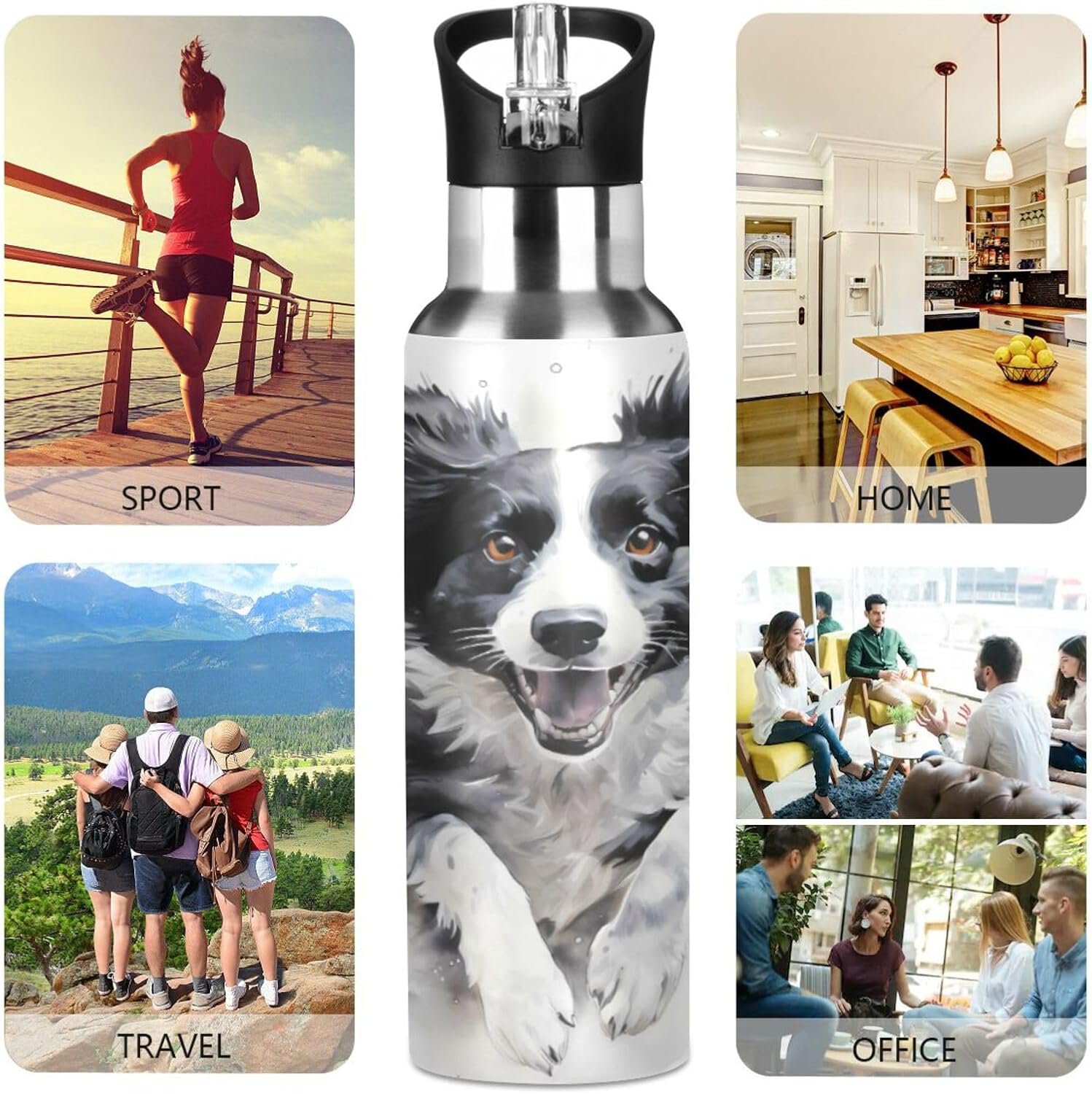 ALAZA Running Border Collie Water Bottle with Straw Lid Vacuum Insulated Stainless Steel Thermo Flask Water Bottle 20oz