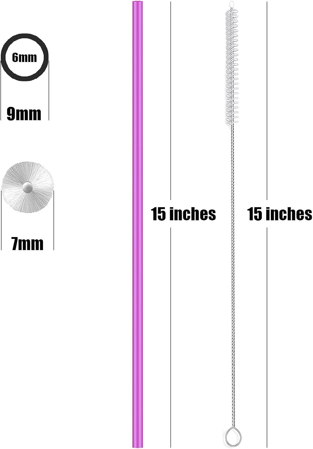 CONTENT – includes 4 counts 15 in (6mm inner dia and 9mm out dia) extra long silicone straws, 2 counts 15 in extra long cleaning brush