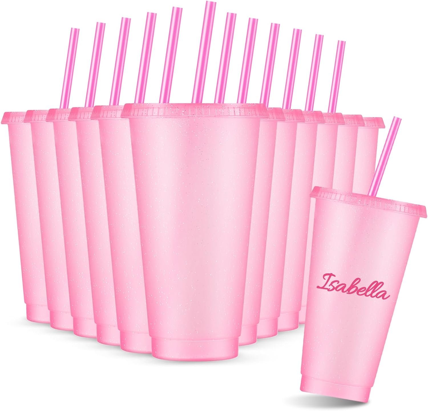 Amyhill 12 Pcs Reusable Glitter Cups with Lids and Straws 24 oz Plastic Tumbler Iced Coffee Cup Travel Mug for Smoothie Juice Birthday Sleepover Party Supplies for Valentine Girl(Light Pink)
