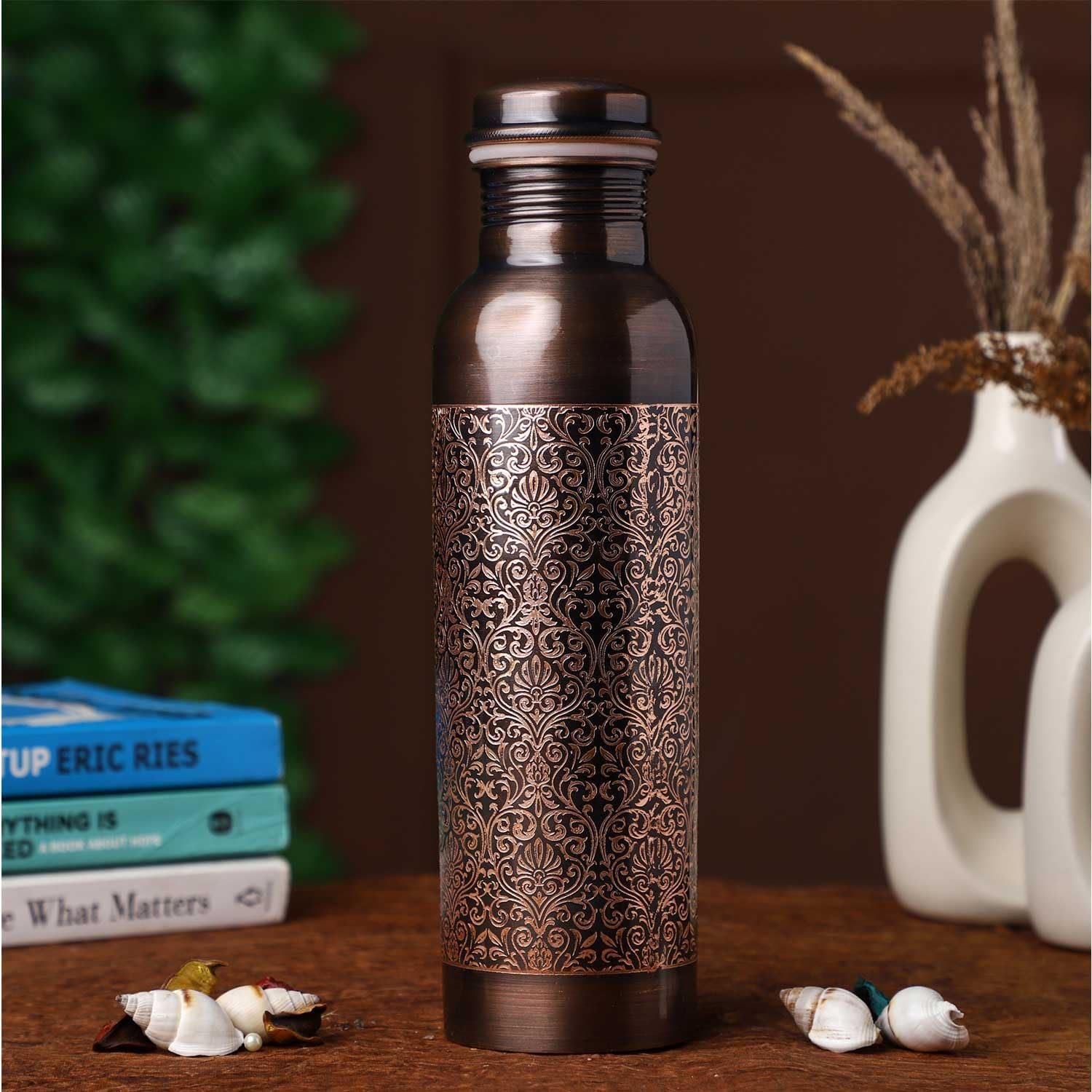 etching pattern. Handcrafted from pure copper, this bottle blends traditional Ayurvedic wellness with a timeless vintage look.