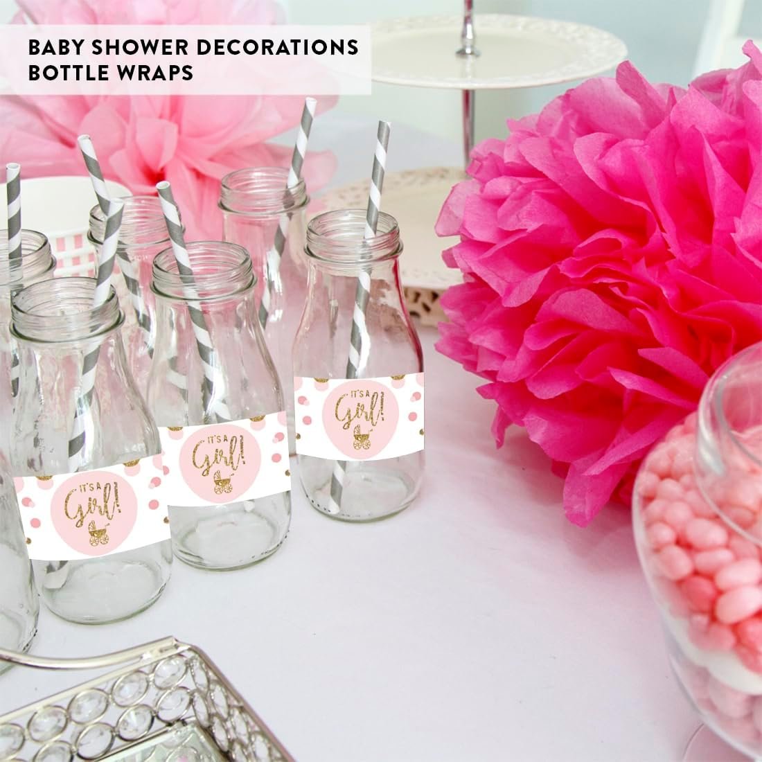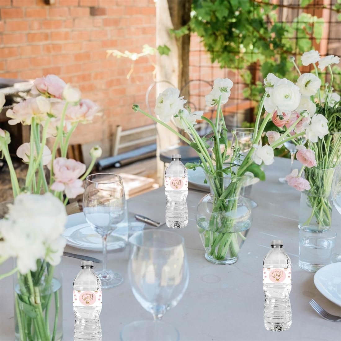 Blush Pink and Gold Accents for Baby Showers: These water bottle stickers baby shower girl theme add decorative detail to drink stations; complete baby shower setups with water bottle stickers for baby girl that coordinate with the event decor; use baby shower labels for bottles for an organized beverage display; match party essentials with pink water bottle labels baby shower girl to complement pink and gold themes; personalize celebrations with its a girl water bottle labels for baby shower