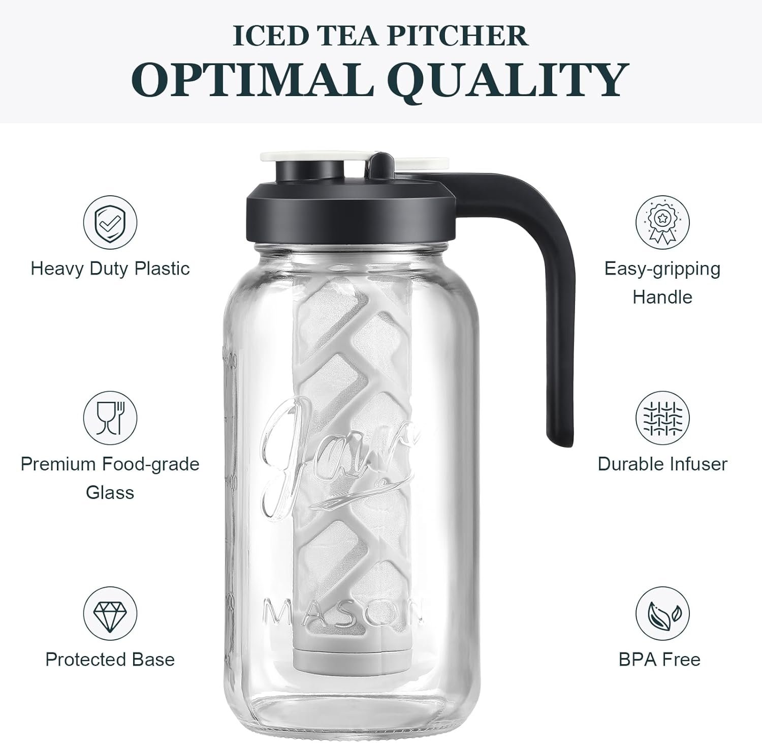 Premium Quality Construction: Crafted with high-grade, durable glass, our crystal-clear mason pitcher offers a pristine view of your beverages while standing up to daily use, ensuring long-lasting performance.