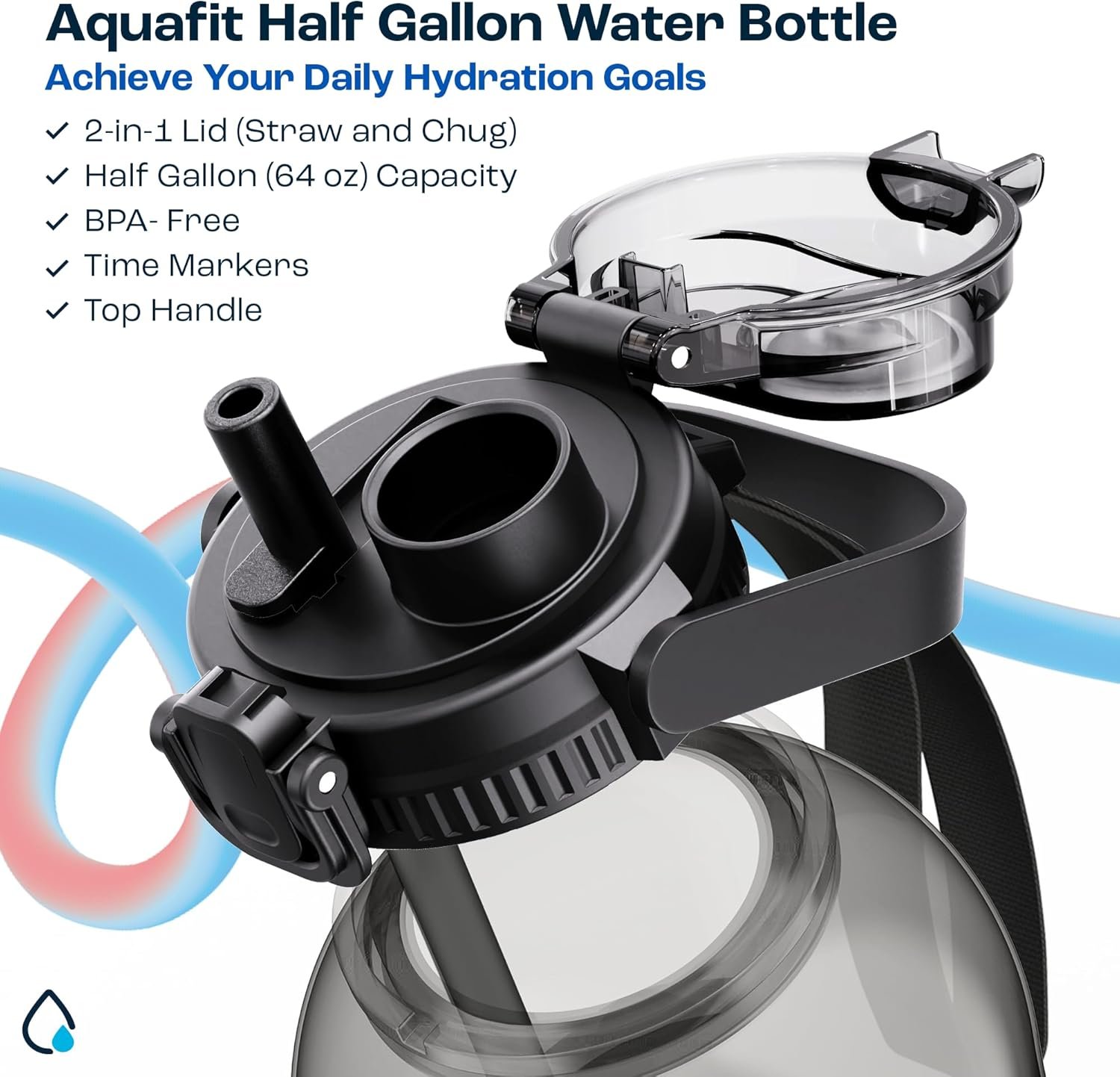 2-in-1 Chug & Straw Lid – Our half gallon water jug comes with a dual functionality lid that allows you to chug or sip without having to change the lid. The smart, off-centre placement of the lid lets you use both the spouts with ease – sip while you work and chug after a rigorous workout!