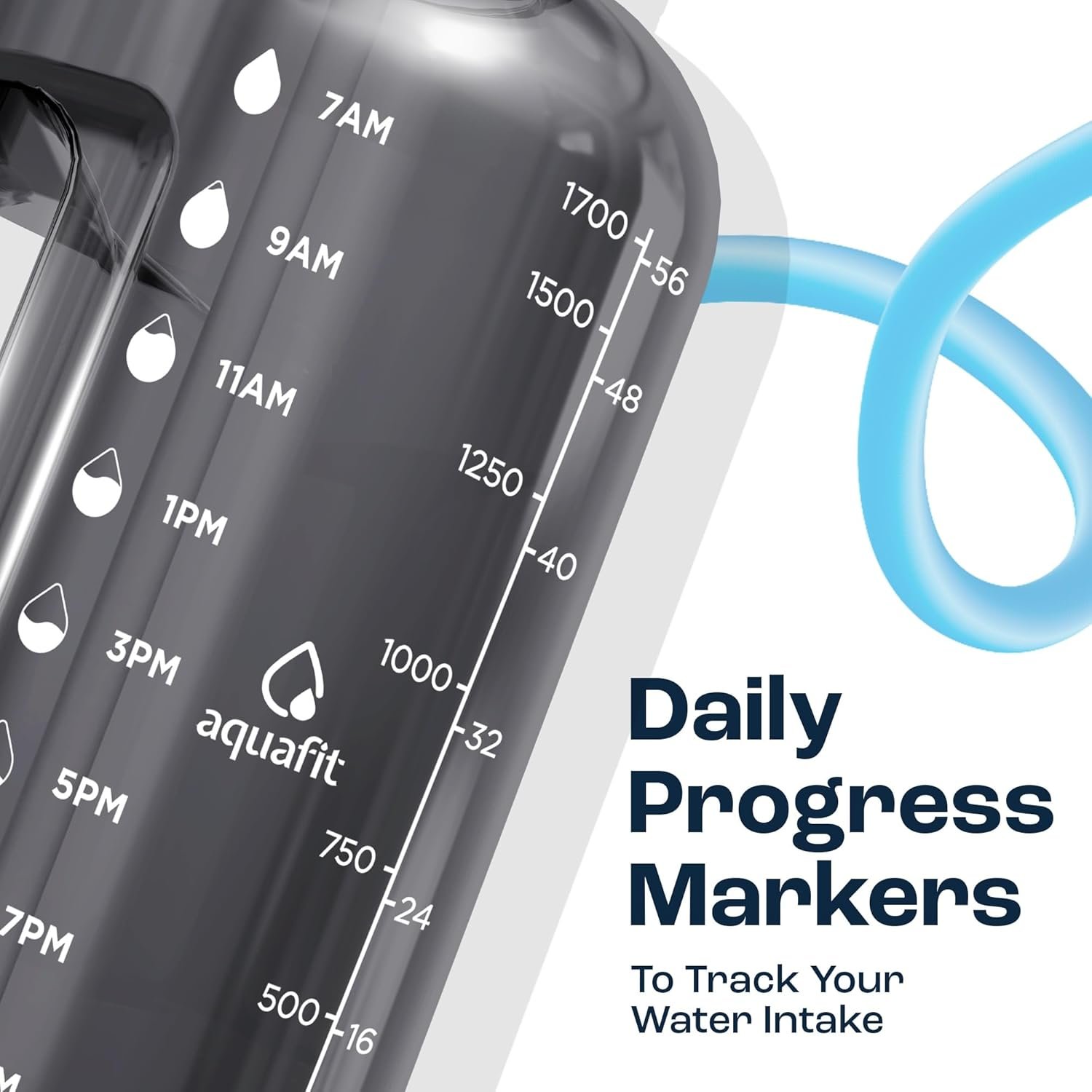AQUAFIT 64 oz Water Bottle with Time Marker – Straw & Chug Lid – BPA Free Half Gallon Gym Water Bottle with Handle – Big Gallon Jug (Gray, 64 Ounces)