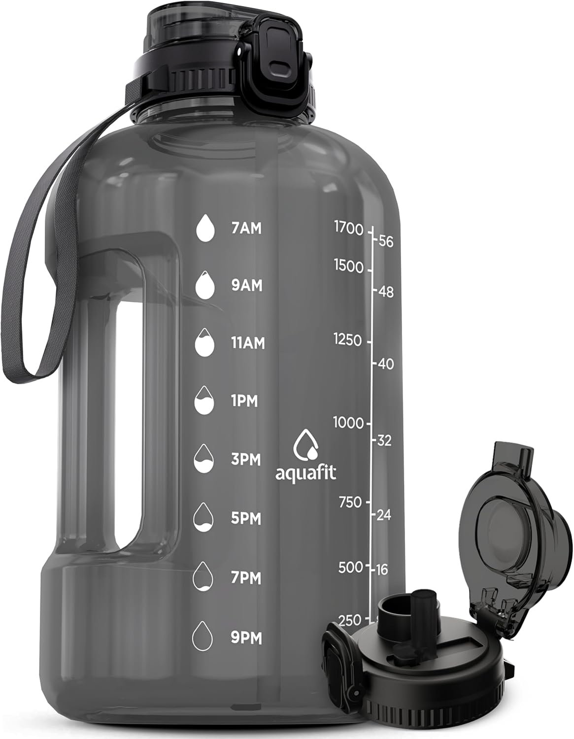 AQUAFIT Half Gallon Water Bottle with Time Marker – Straw & Chug Lid – BPA Free Gym Water Bottle with Straw – Big Gallon Jug (Gray, 64 oz – 2in1 Lid)