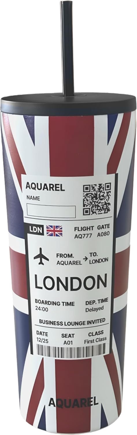 AQUAREL City Edition London 24oz Tumbler – Stainless Steel Vacuum Insulated Travel Cup with Lid & Straw, Double Wall Insulated Iced Coffee & Water Bottle, Union Jack & Big Ben Design