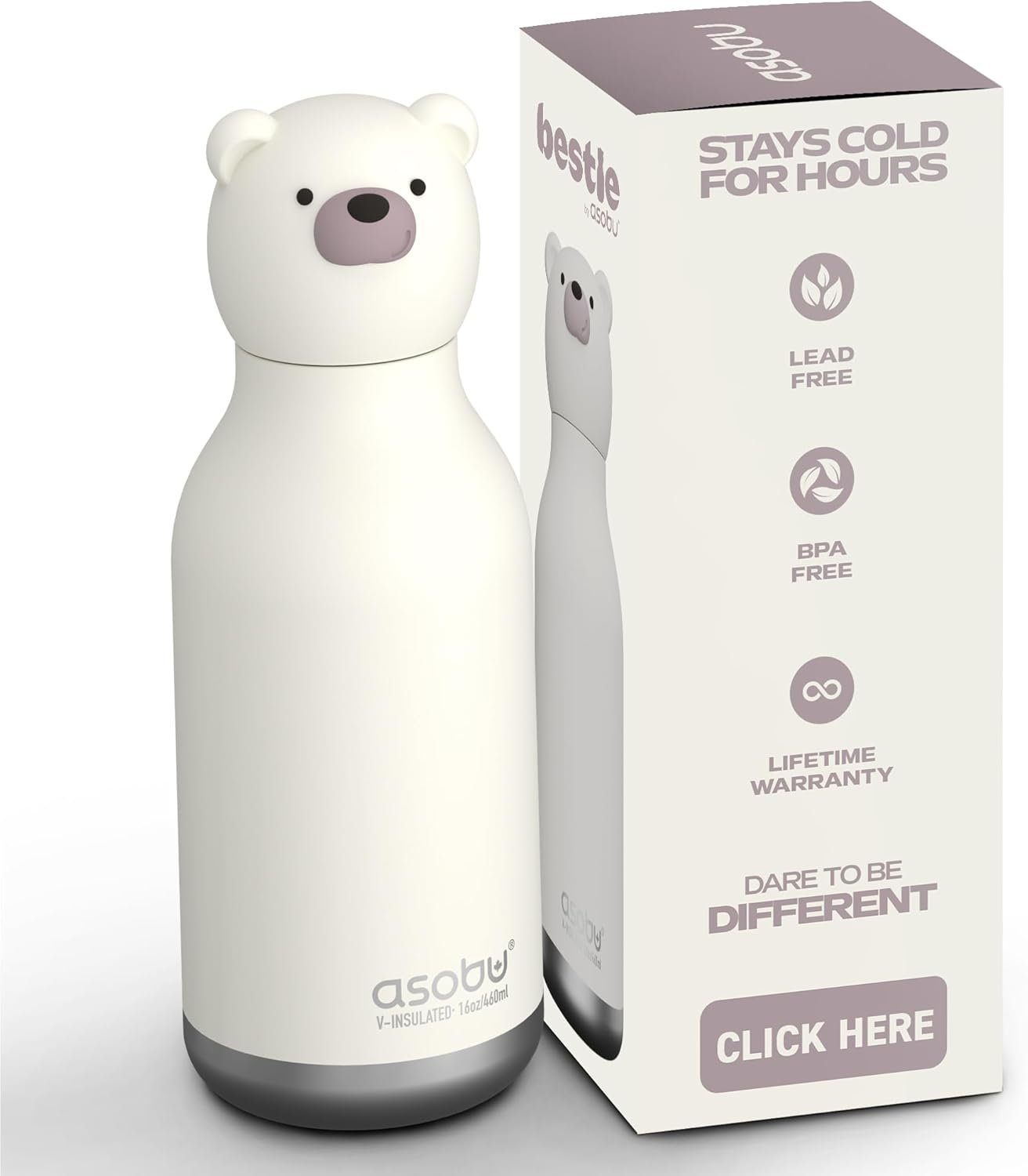 asobu Bestie Bottle Insulated Stainless Steel Water Bottle with Detachable Soft Animal Head Fun Drinking For Kids and Teens16 Ounce (Bear)