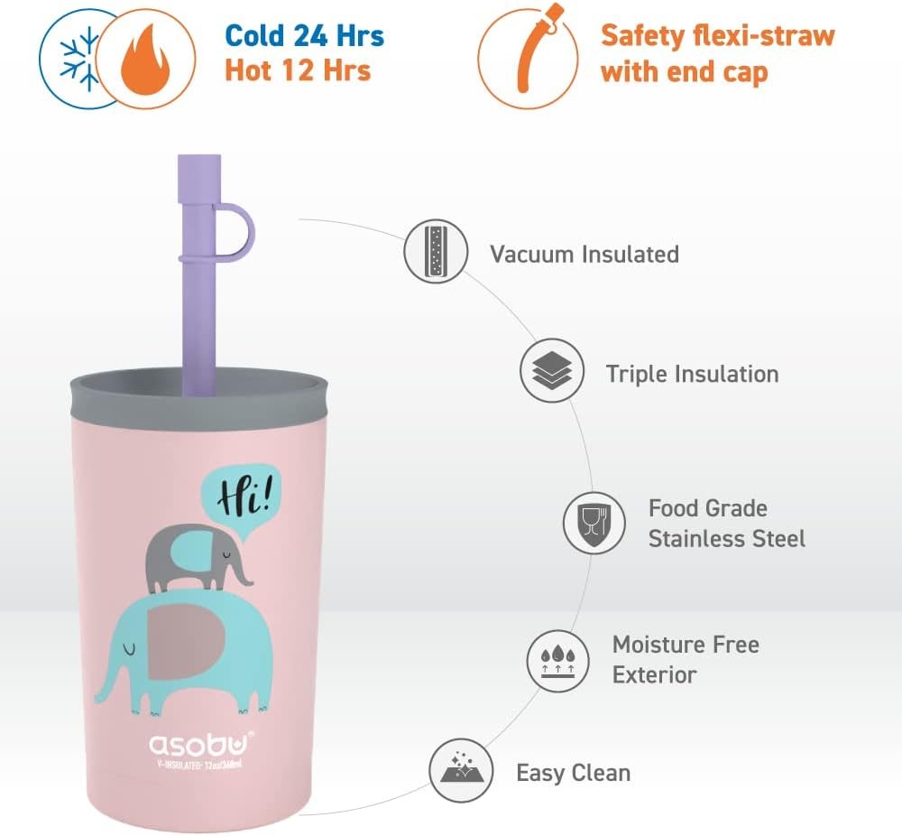 asobu Stainless Steel Kids Tumbler with Flexible Straw Lid | Insulated Water Bottle | Reusable Travel Cup 12 Ounce (Pink)