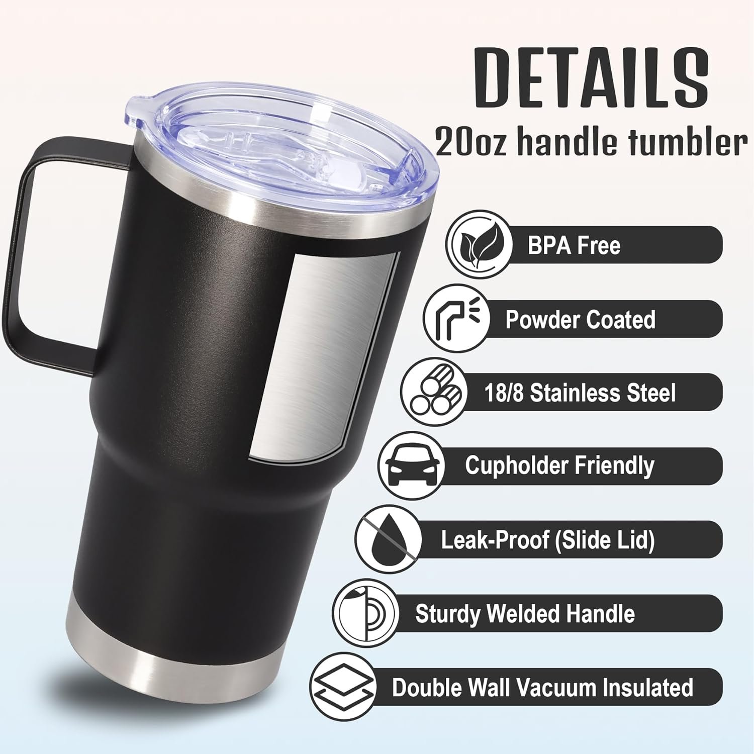 Stainless Steel Tumblers with Handle: Crafted with thickened 304 (18/8) food-grade stainless steel, 20oz coffee mug features a sweat-proof matte powder-coated exterior and polished interior for sweat-proof, rust-proof, odorless. 360° welded handle ensures secure grip and durability.