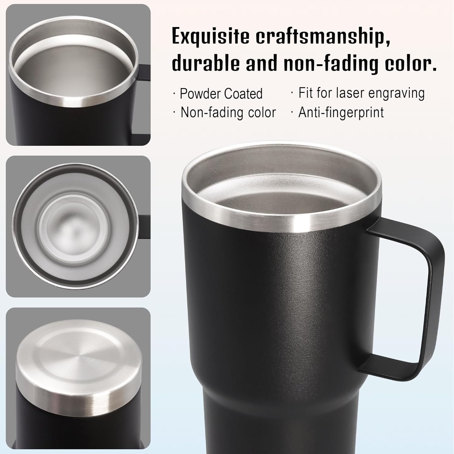 Stainless steel coffee tumblers are coated with high quality fade-resistant powder coating, the surface will not flake or crack, sweat-resistant.