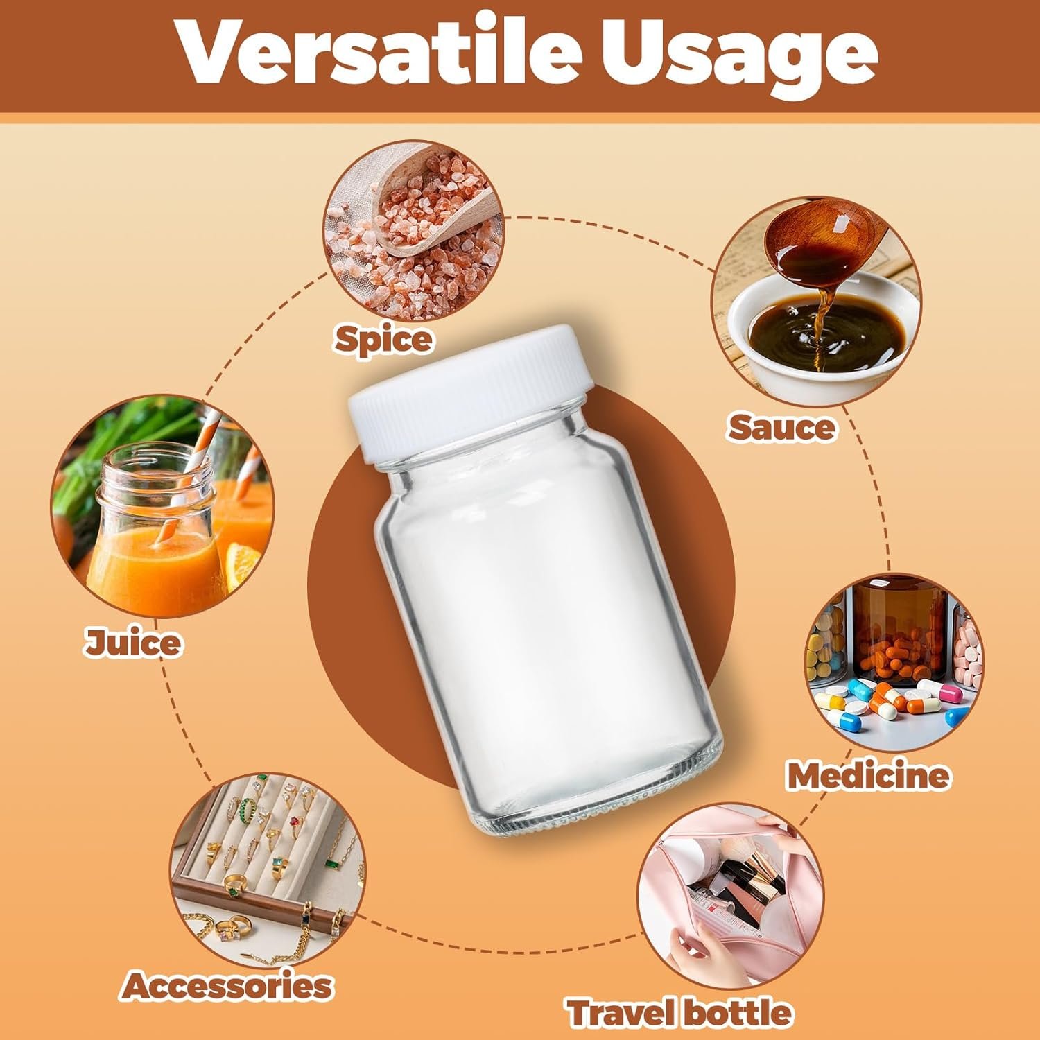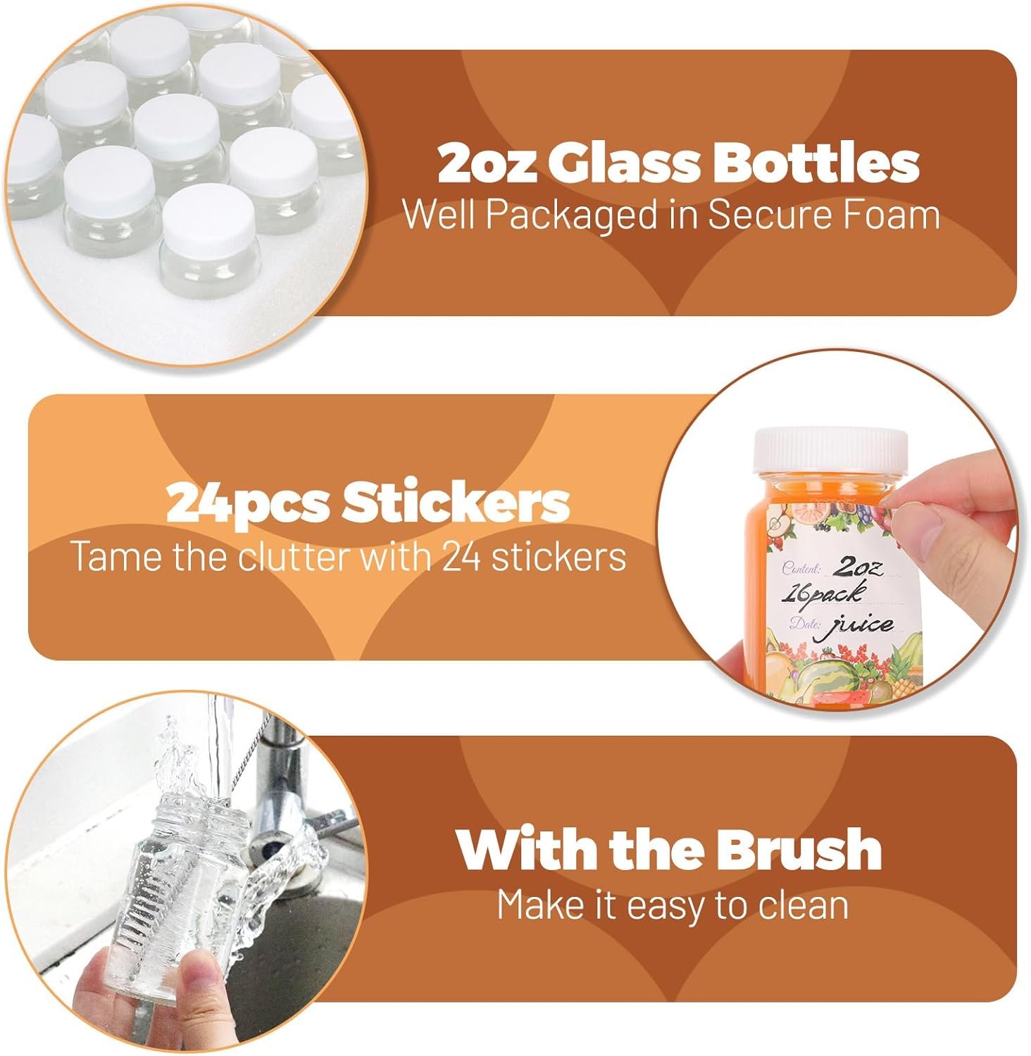 Value Pack: Great-value mini glass bottles set-16 bottles with lids, 24 stickers, and cleaning brush included! No need to buy accessories separately, saving you time and money. Durable glass lasts long, so this pack serves you for months. Perfect for anyone who loves organized storage