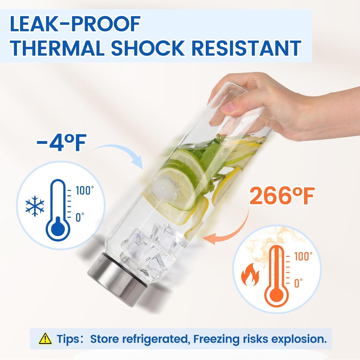 Thermal Shock Resistant: Premium borosilicate glass handles sudden thermal shocks—refrigerate to brew, no cracks. Ideal for both cold drinks and hot beverages. This glass juice bottle is safe for dishwasher without the lid.Tips: Store refrigerated, Freezing risks explosion