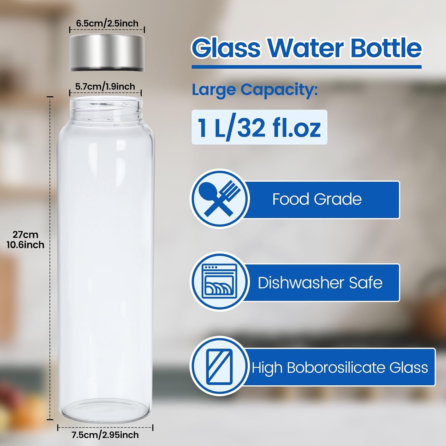 Food-Grade Borosilicate Glass: Crafted with pure borosilicate glass, this 32 oz borosilicate glass water bottle safely holds water, juice, tea, or coffee—preserving true taste with no aftertaste or residues. Crystal-clear walls showcase vibrant drink colors and precise fill levels