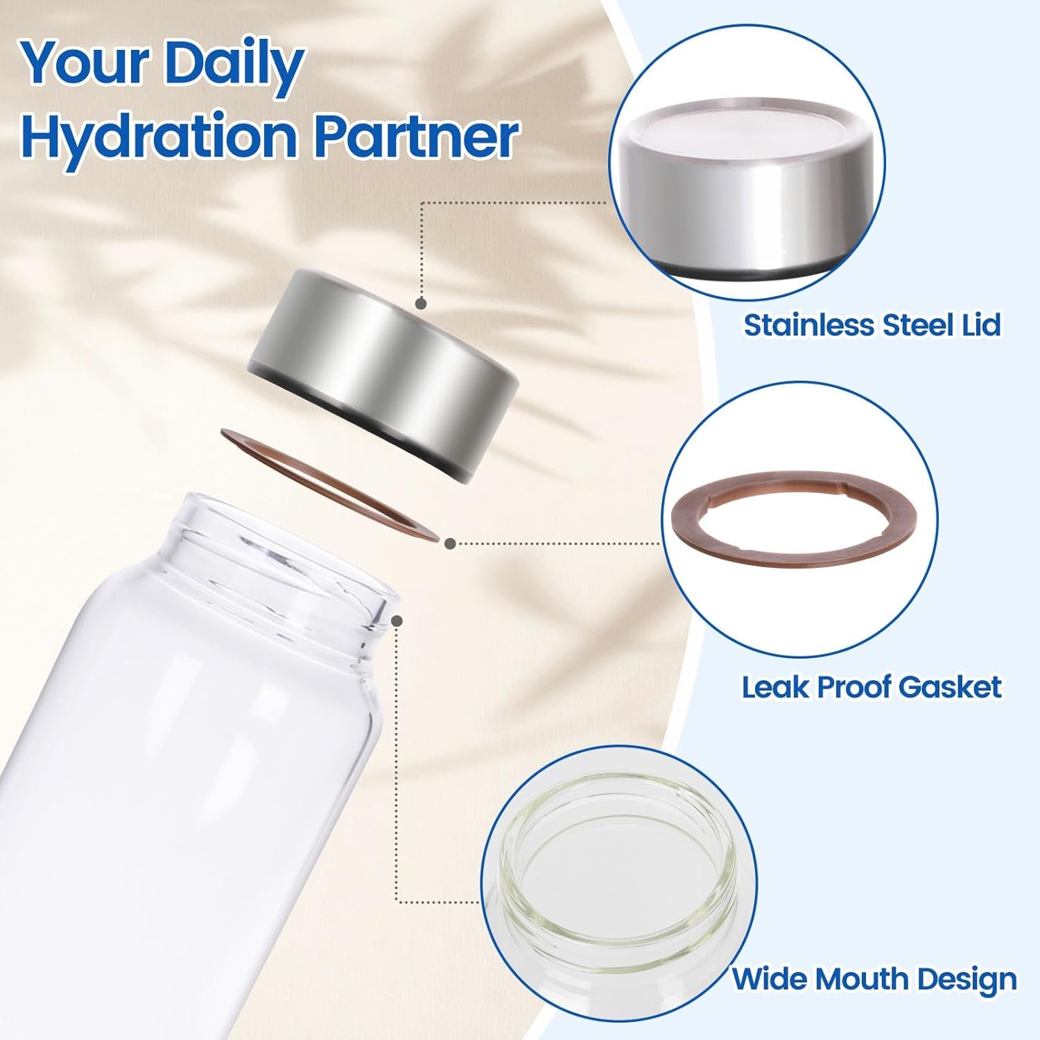 Leak-Proof Stainless Steel Lid: The precision-engineered stainless steel cap with a silicone sealing ring clicks securely onto glass drinking bottle with lids, delivering reliable liquid containment against shakes, drops, or backpack pressure—stash worry-free in gym bags, hiking packs, or under-seat carry-ons