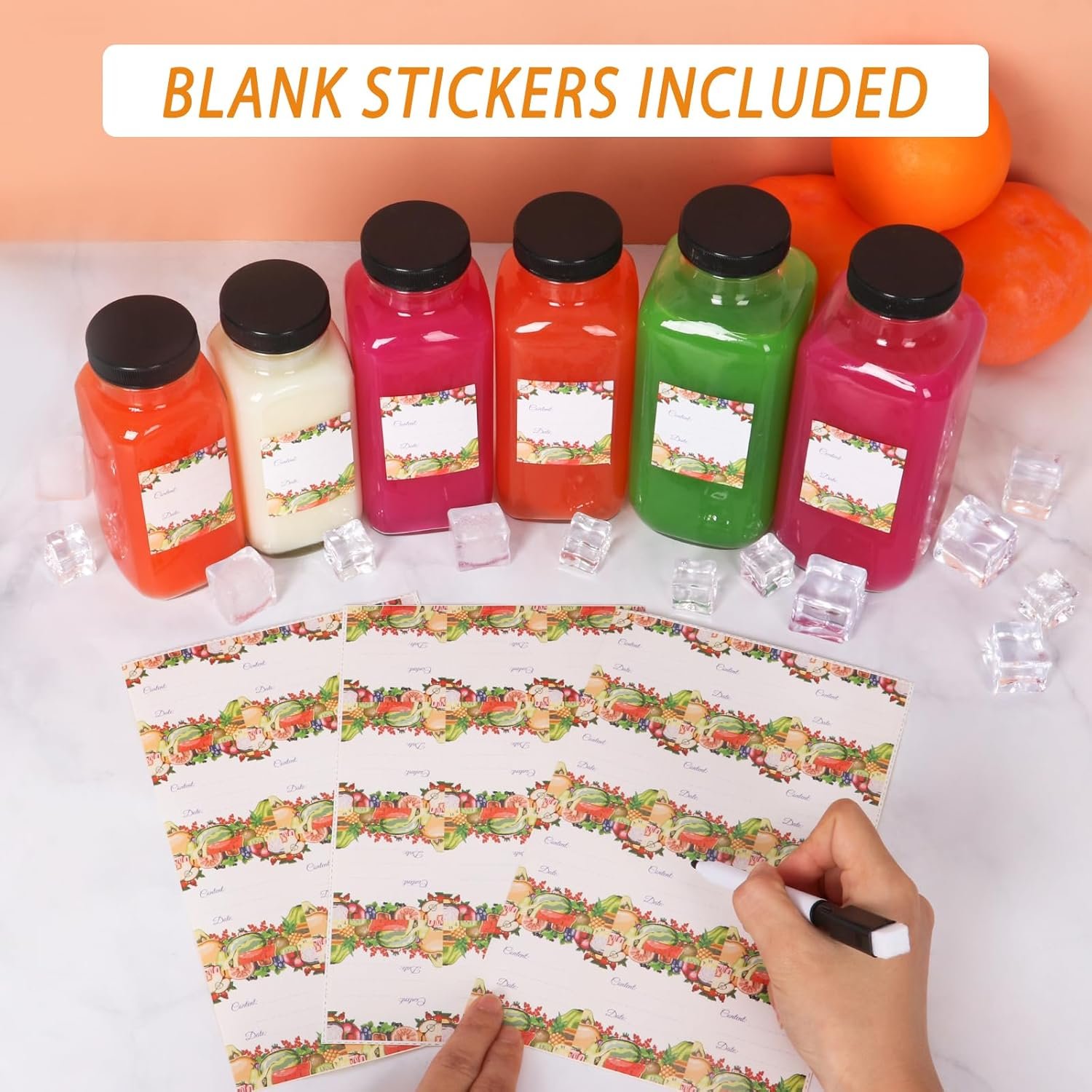 VALUE PACK: Each package includes 3pcs glass juice bottles with lids 8 oz with 12pcs customized stickers and 1pc sponge bottle brush.These glass bottles are ideal for storing and carrying beverages like milk, coffee,juice or kombucha on the go