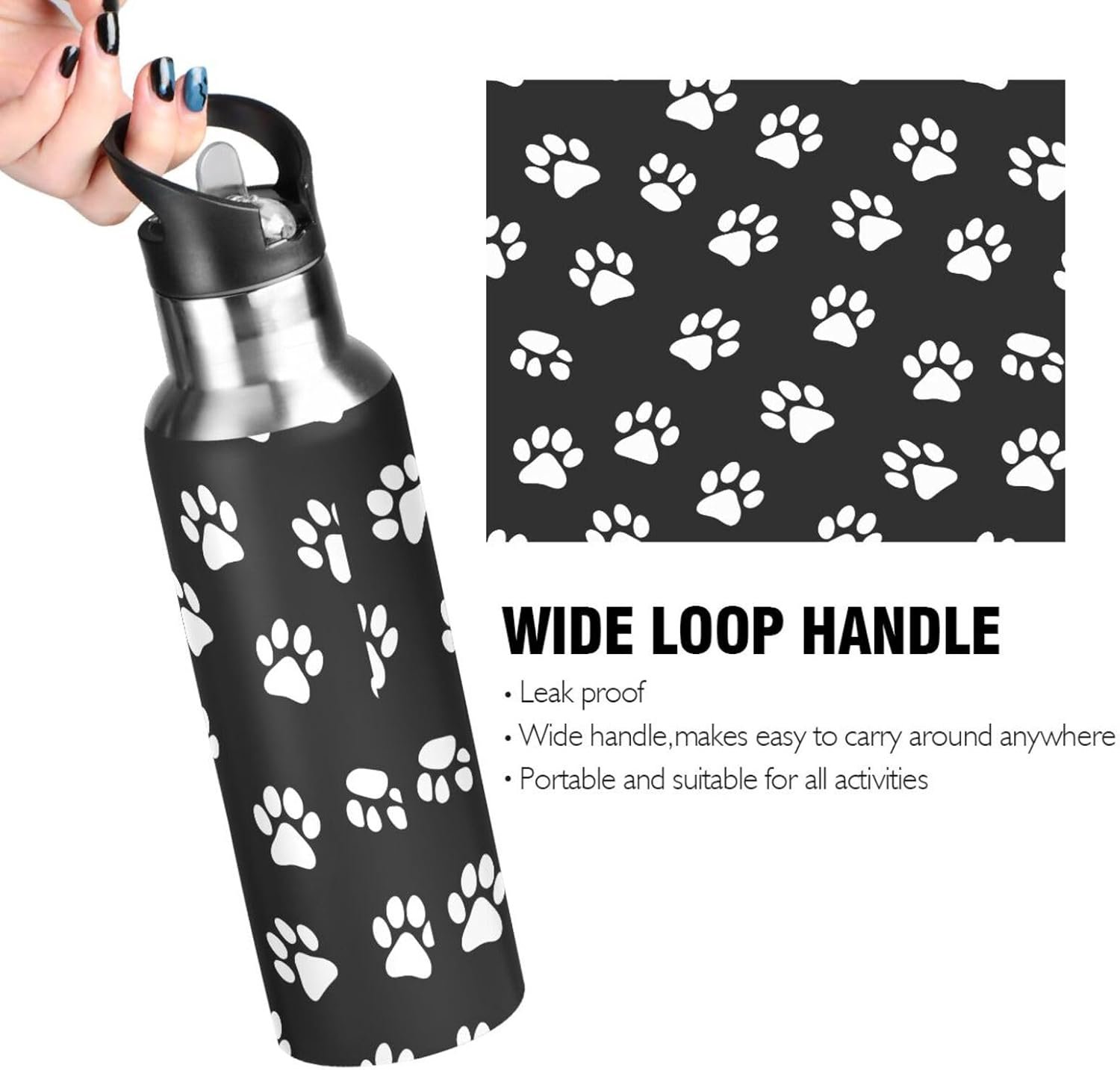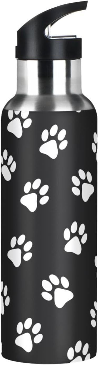 AUUXVA Sports Water Bottles Dog Paw Print Black White Vacuum Insulated Stainless Steel Water Bottle with Straw Lid for Travel Fitness Outdoor Sports Gym, 20 oz