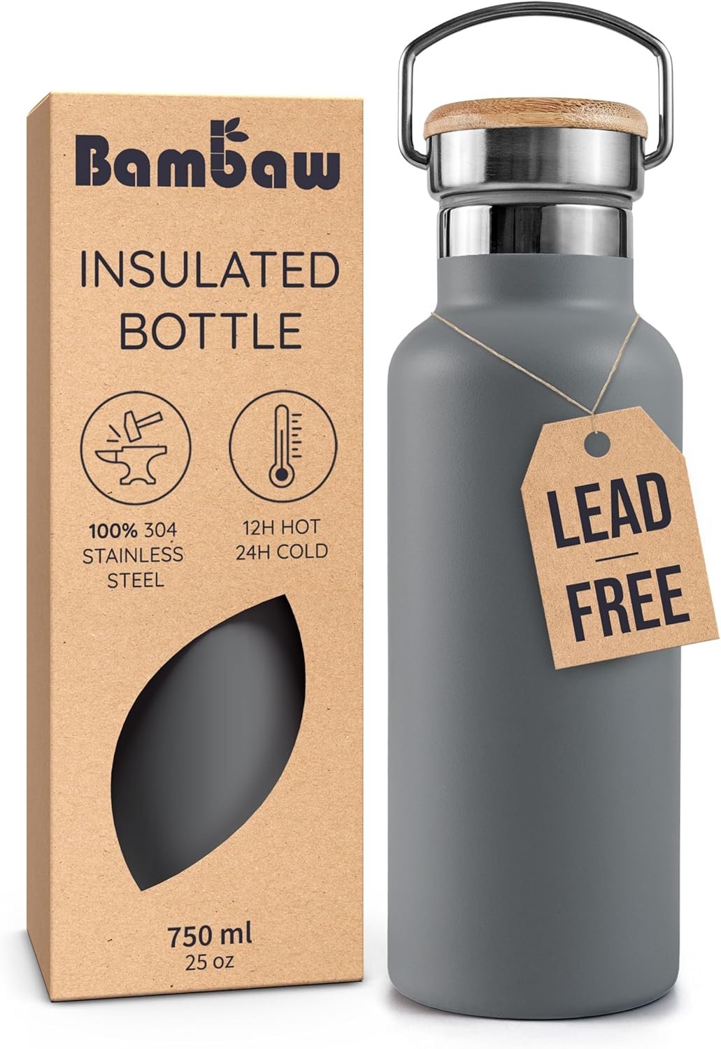 Bambaw Gray Insulated Water Bottle 24oz, Stainless Steel Water Bottle, Travel Water Bottle 24 oz, Metal Water Bottle without Straw, BPA Free Water Bottle Dishwasher Safe – Stormy Gray
