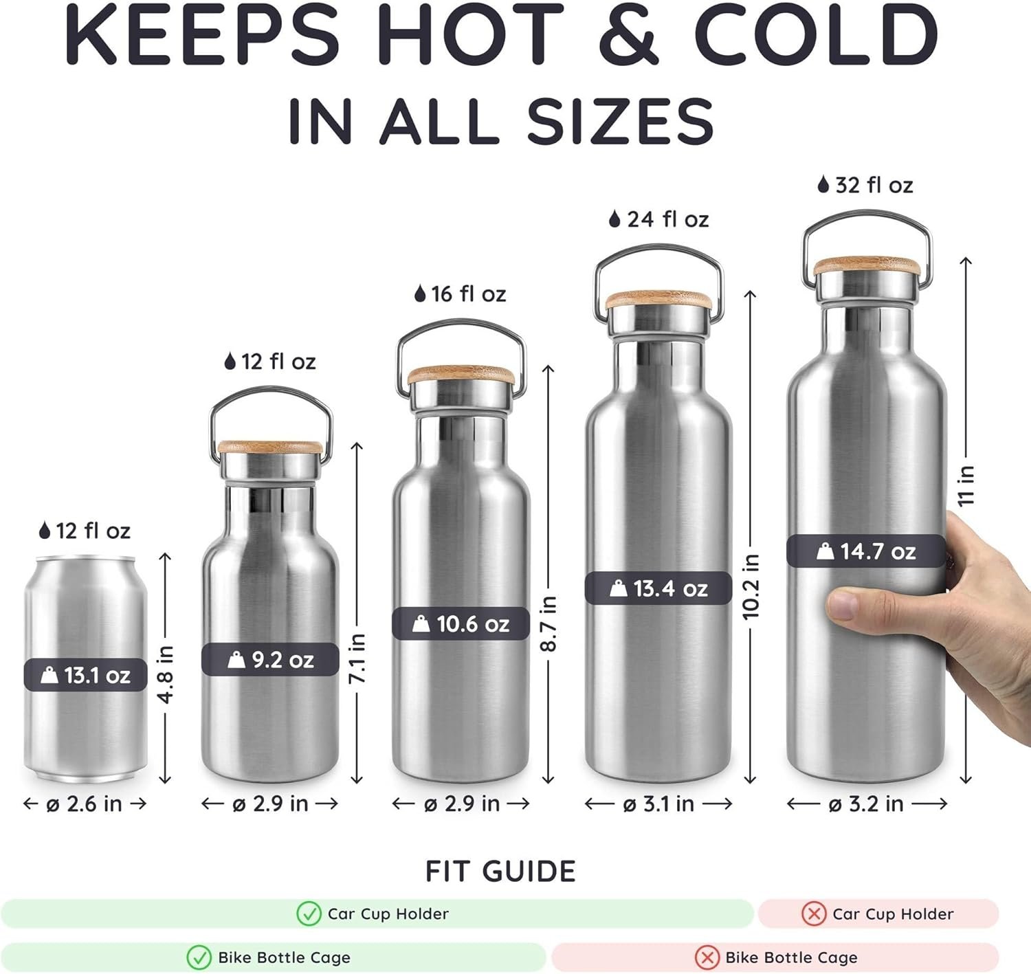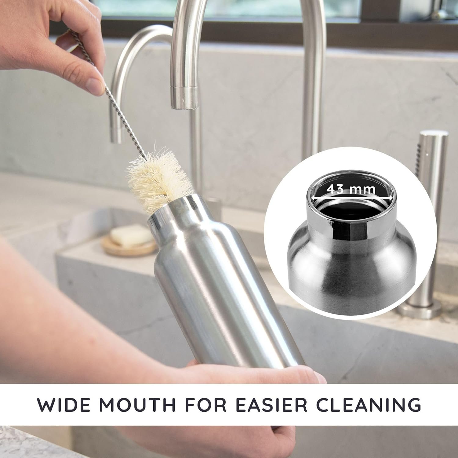 BIG OPENING: The opening of the metal water bottle is big enough to add ice cubes or a tea infuser which makes it perfect for all your drinks – hot and cold. The wide neck makes it possible to infuse fruits in your double wall water bottle.
