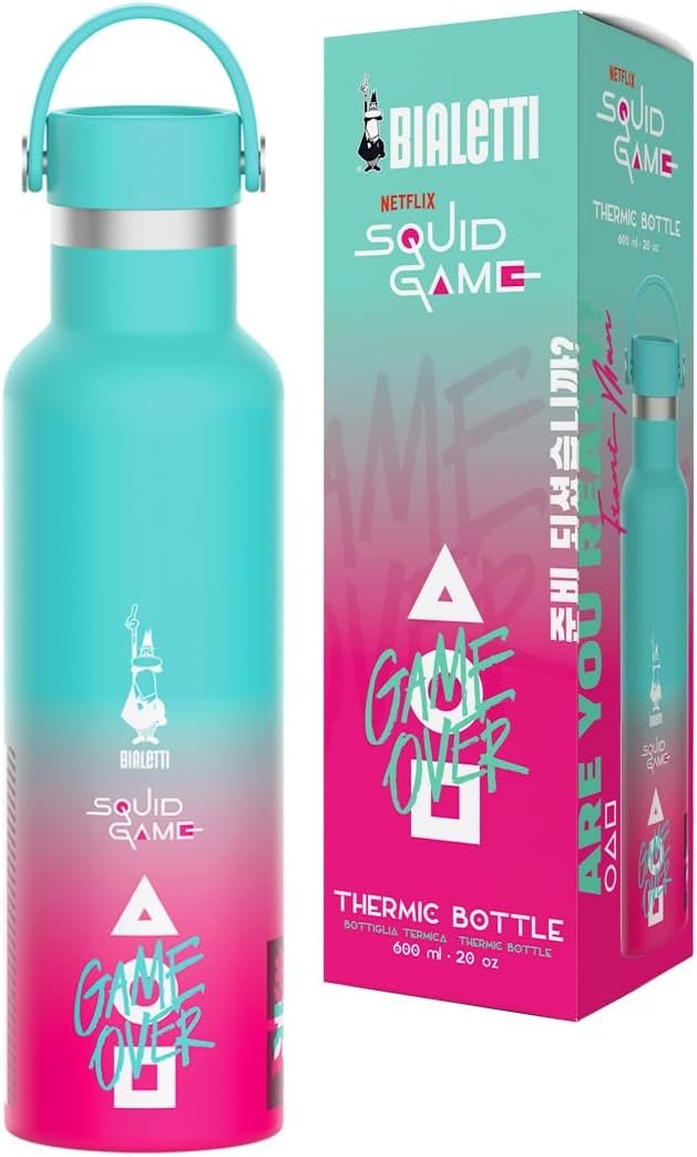 Bialetti and Netflix team up again to launch a unique and brightly colored Capsule Collection that celebrates the Korean series that drove the world crazy: Squid Game. This collection features a new assortment of double-wall stainless steel accessories, perfect for carrying your favorite drinks wherever you go. Among the novelties is the 20 oz (600 ml) thermo flask, a standout addition to the Bialetti range. This double-wall insulated tumbler, made of high-quality stainless steel, features a secure click closure lid to maintain the temperature of your drink, keeping beverages hot for up to 12 hours or cold for up to 24 hours. Designed with a practical hook for easy carrying, it’s perfect for use in any situation, whether on a long car journey or around the city. Combining durability and style, the flask showcases bright colors, geometric details, and the iconic “Game Over” writing, making it a must-have for Squid Game fans. Ideal for travel, outdoor activities, and daily use, this insulated travel water bottle is perfect for anyone who loves Squid Game and quality drinkware.