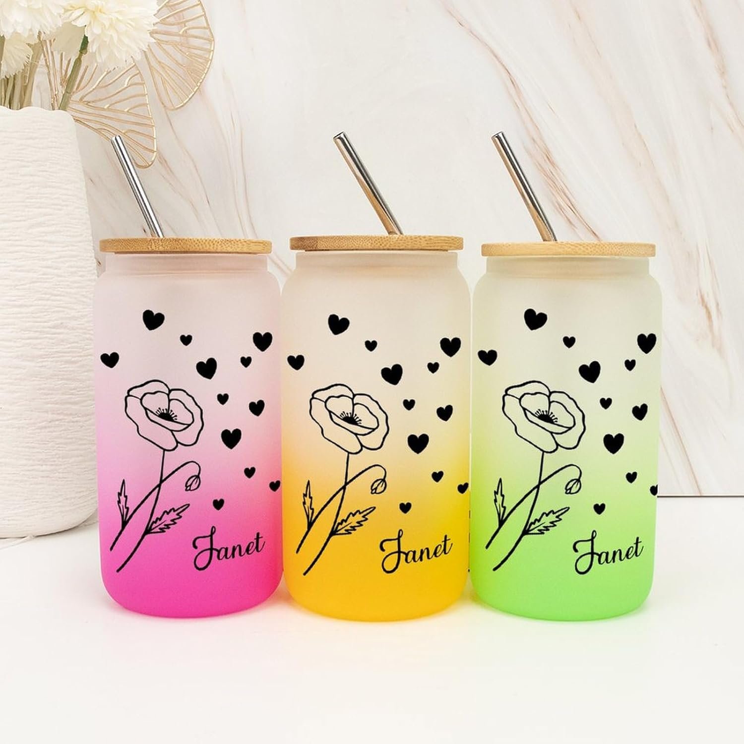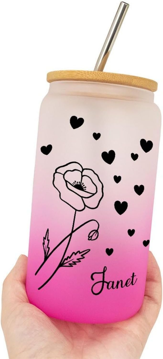 Birth Flower Frosted Glass Tumbler with Lid Custom Birthflower Glass Water Bottle with Name Retirement Women’s Day Gifts for Colleague Flower Travel 16oz Iced Coffee Mug