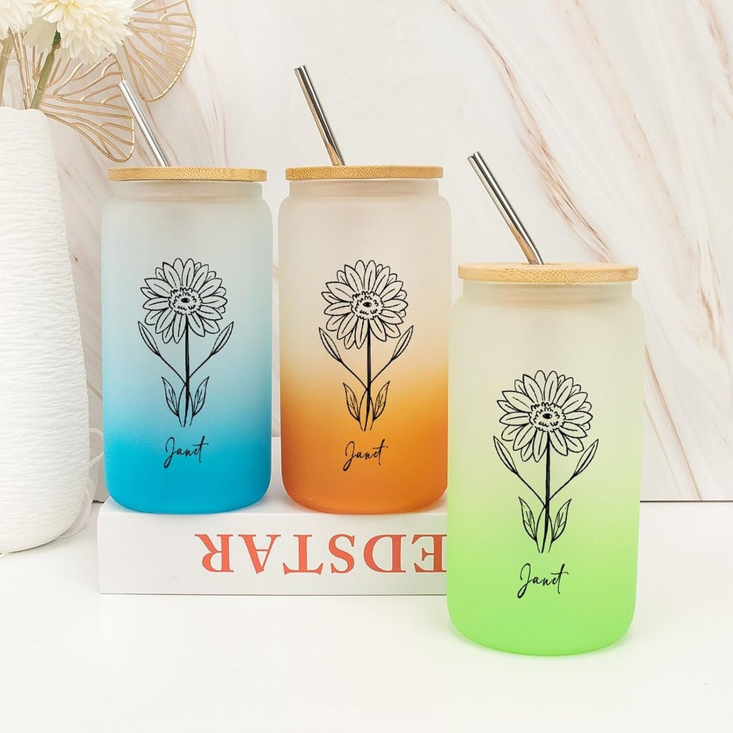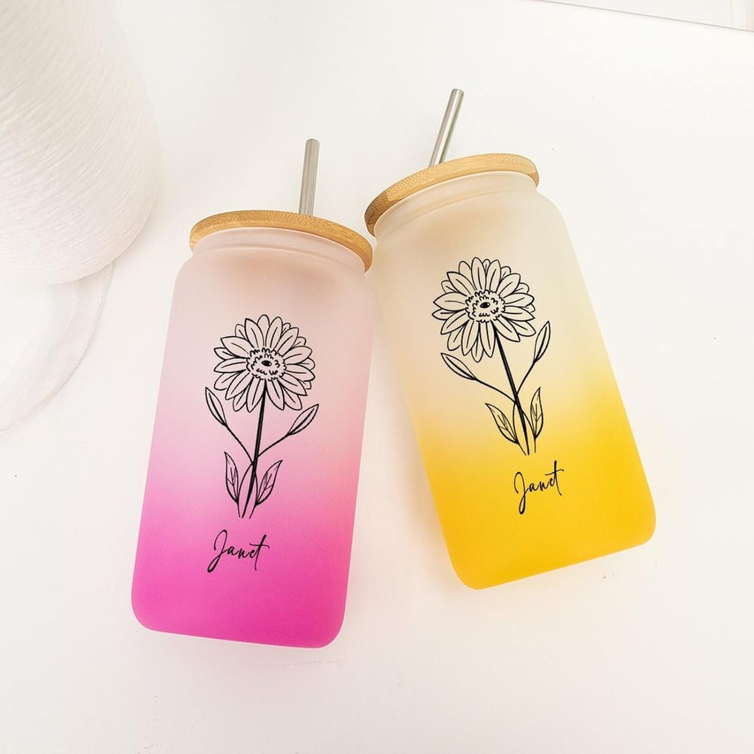 Birth Flower Iced Coffee Cup with Lid And Straw Customized Birthflower Drinking Cup with Name Women’s Day Birthday Gifts for Bridesmaid Flower Party 16oz Glass Water Bottle