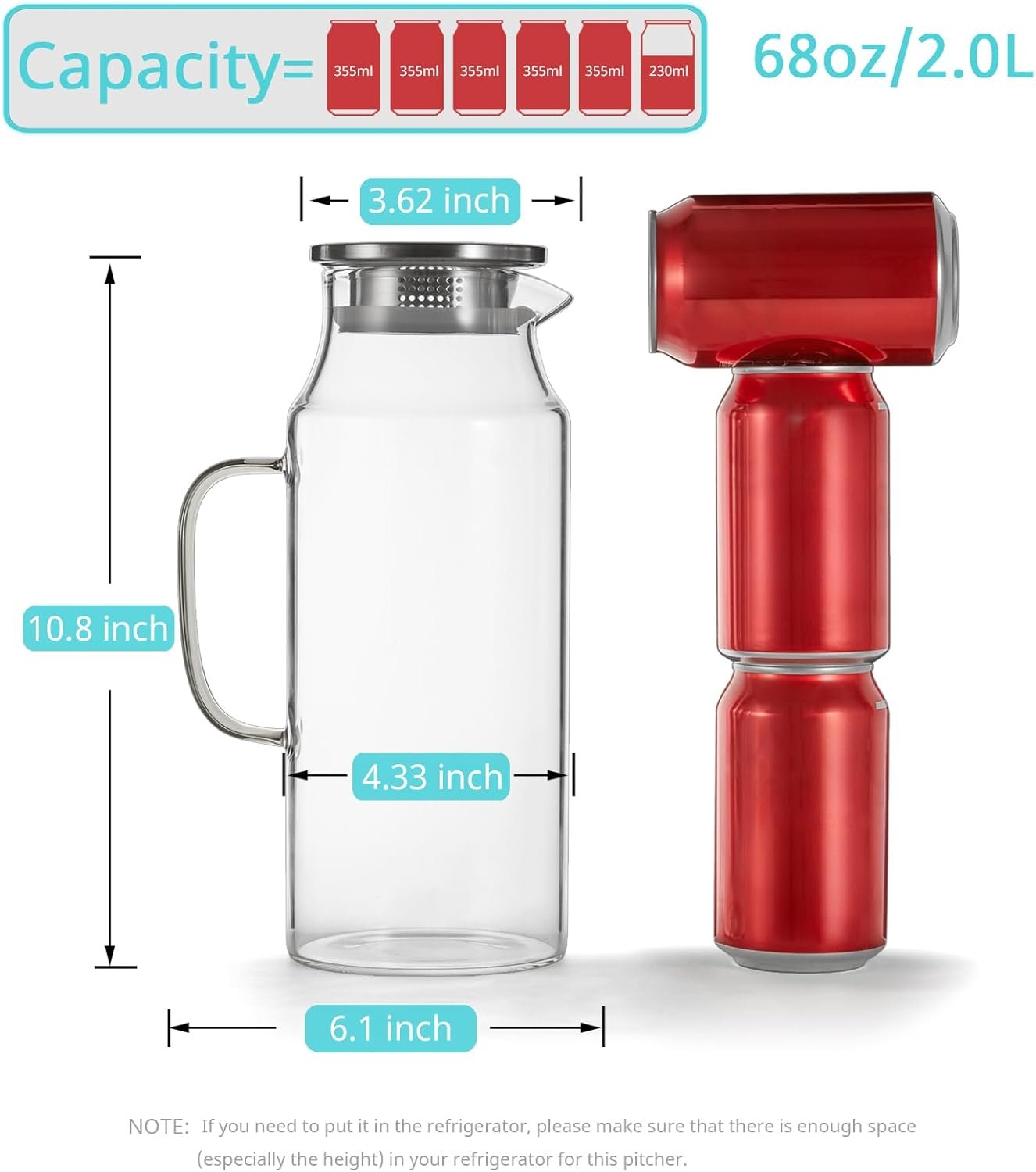 Large Capacity for Versatile Use: The glass pitcher holds 68 oz or 2 liter, which is exceptionally practical and versatile for parties or everyday use. Suitable for water, iced tea, homemade lemonade or juice, sangria, coffee, wine and so on. The size and slim shape is great to fit into the most fridge.(NOTE: If you need to put it in the refrigerator, please make sure that there is enough space in your refrigerator for this pitcher)