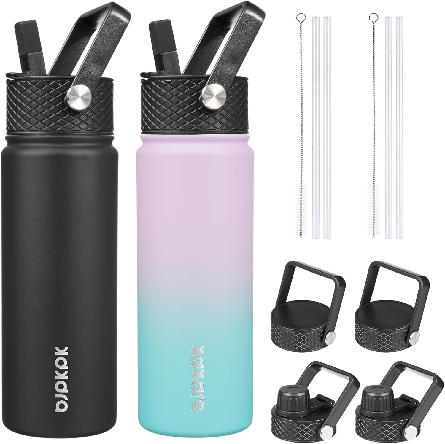 FULLY EQUIPPED: BJPKPK 2 pack metal water bottles equipped 2 insulated water bottles, 6 lids, 4 straws and 2 straw brush to meet your every need. Flex removable lids for drinking smoothie or fruit drinks. Spout lids for hot water. Straw lids for iced beverages. All of the 6 lids are convenient to carry, BPA FREE and leak proof