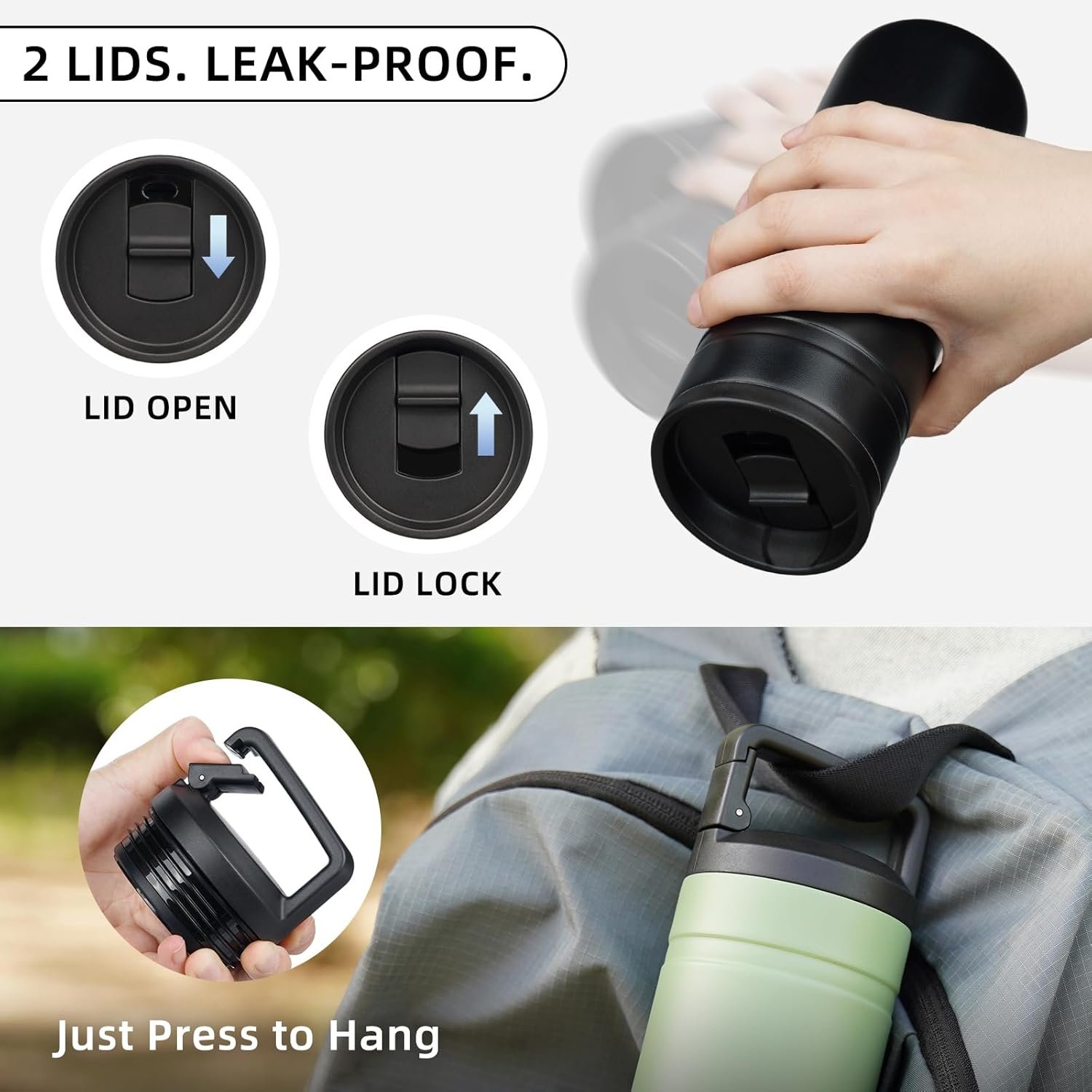 20 oz Adventure-Ready Design – The 20 oz perfect size travel mug features a carabiner handle lid,ideal for outdoor trips.Clip the bottle to your backpack for space-saving convenience.