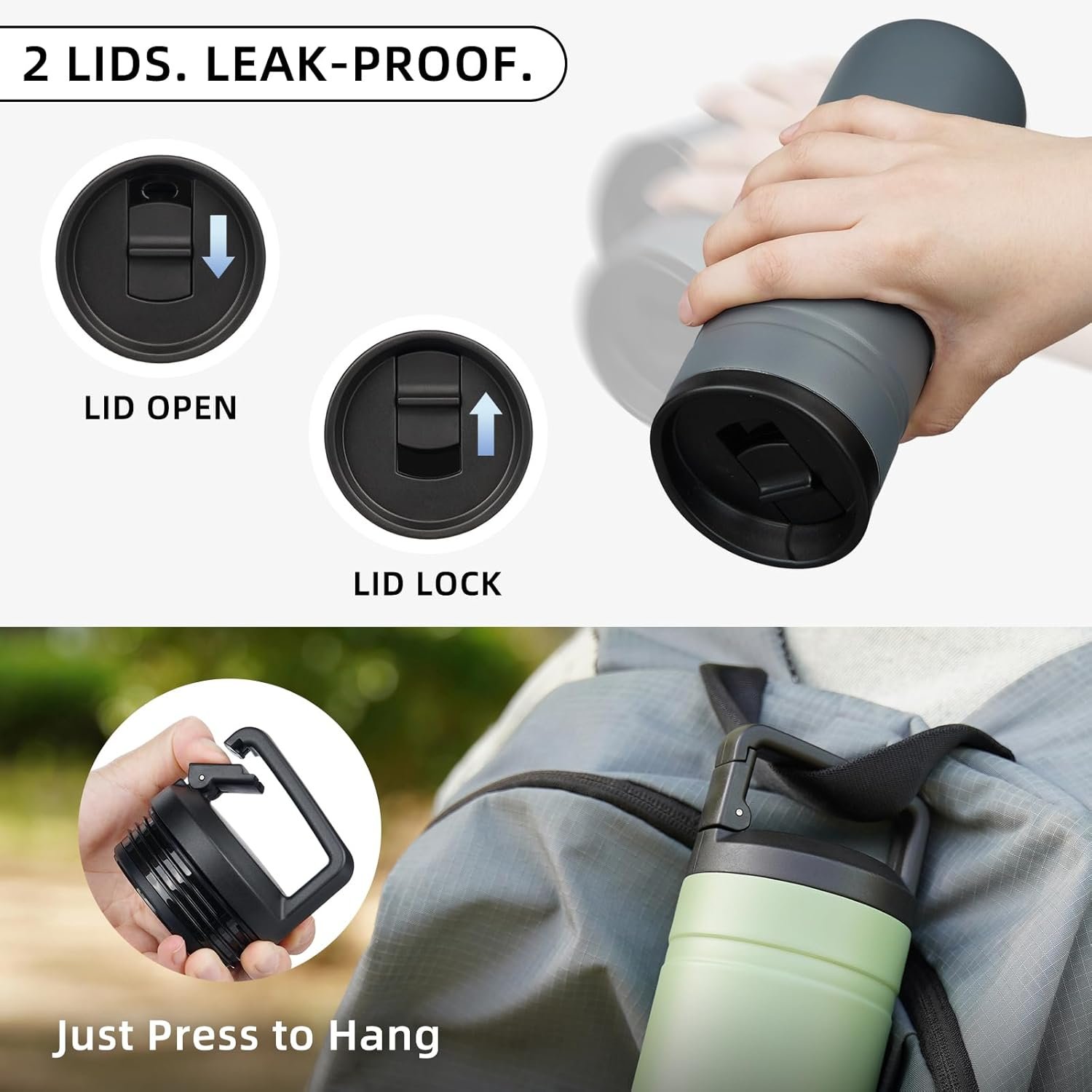 20 oz Adventure-Ready Design – The 20 oz perfect size travel mug features a carabiner handle lid,ideal for outdoor trips.Clip the bottle to your backpack for space-saving convenience.