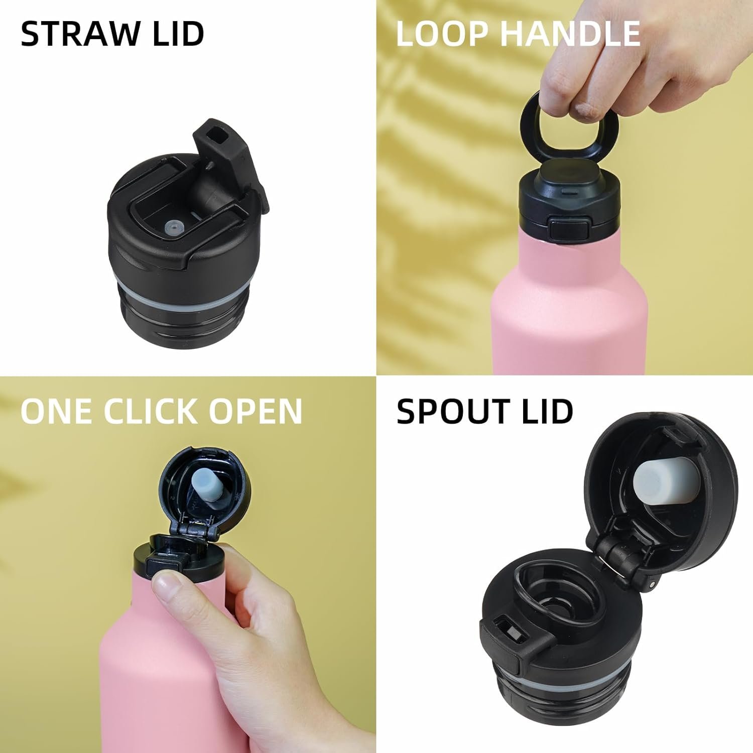 BPA-Free Leakproof Lids: Comes with 2 different lids options. Straw lids for iced beverages. Spout lids for hot drinks. Both lids flip open with a simple button push, making the ideal hydration companion for the daily water drinking