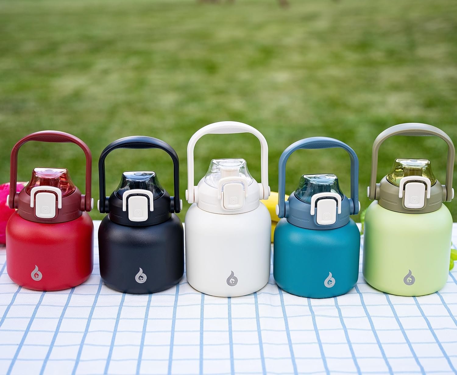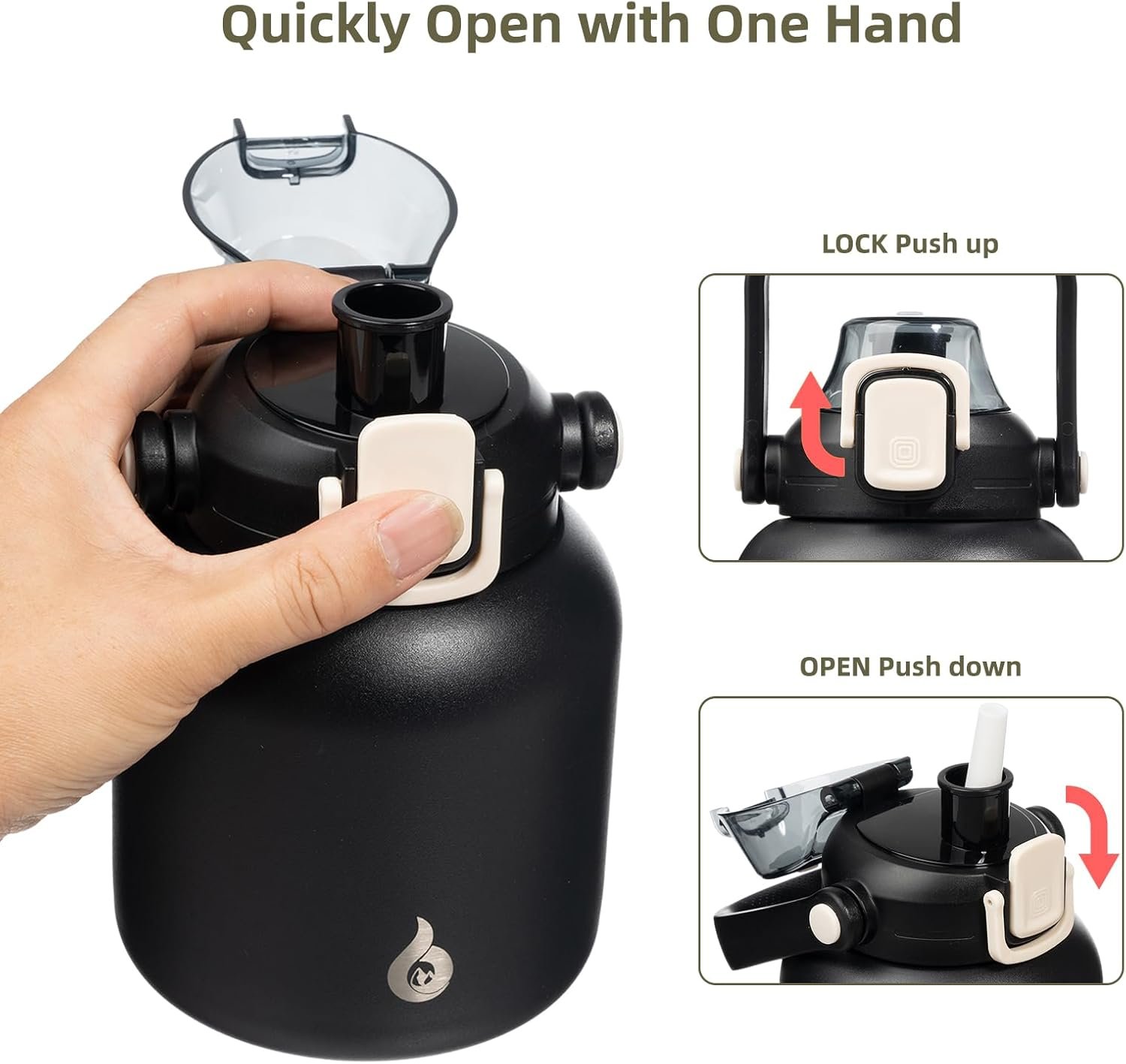 INSULATED WATER BOTTLE WITH ONE-CLICK OPENING LID: Just push the button with one hand, the straw will pop out automatically, our insulated water bottle with straw gives you an easier way to drink water. The straw is removable, you can enjoy sipping with straw or fast water flow without straw. This upgraded lid comes with a safety lock and dust-proof cap that ensures 100% leakproof and healthy daily water drinking