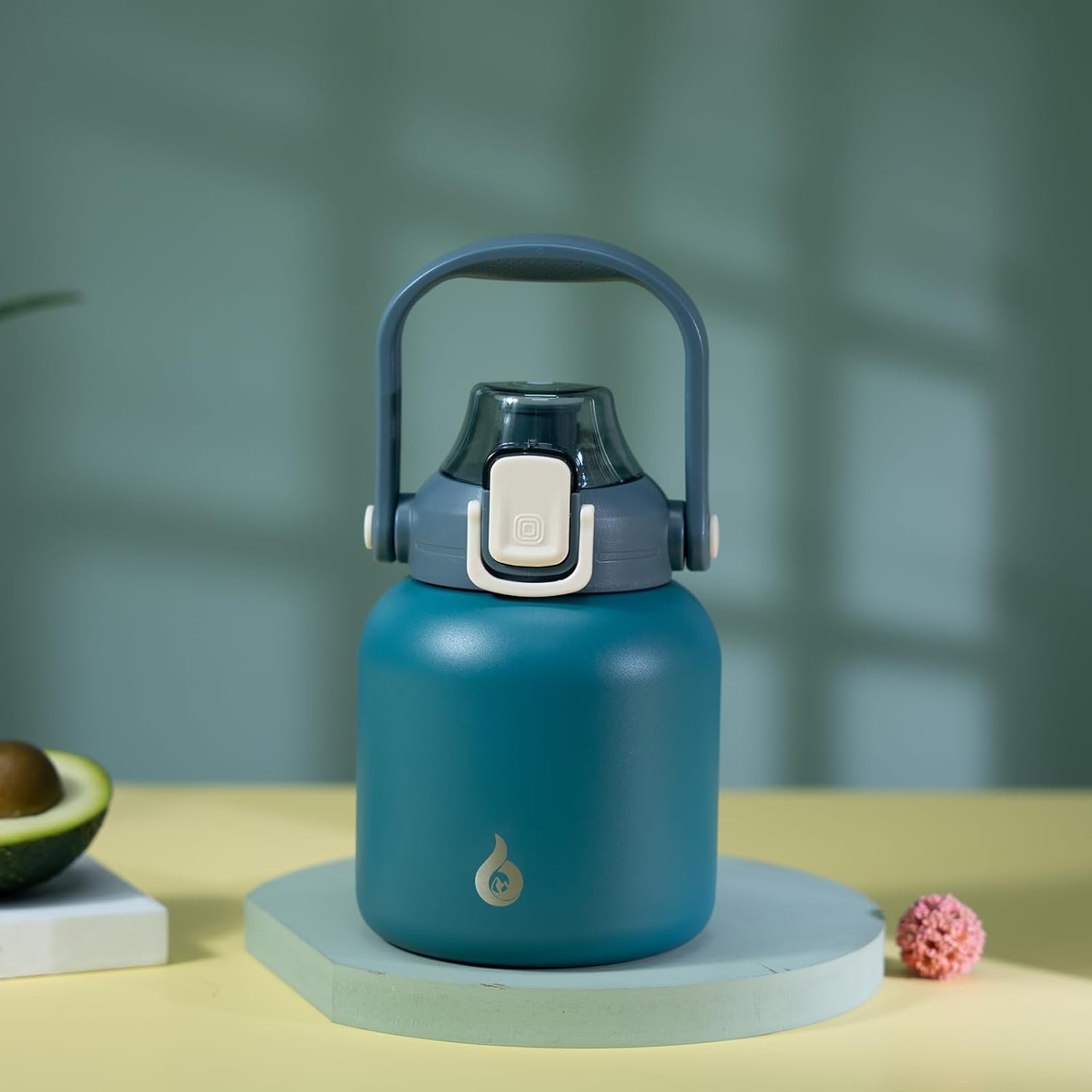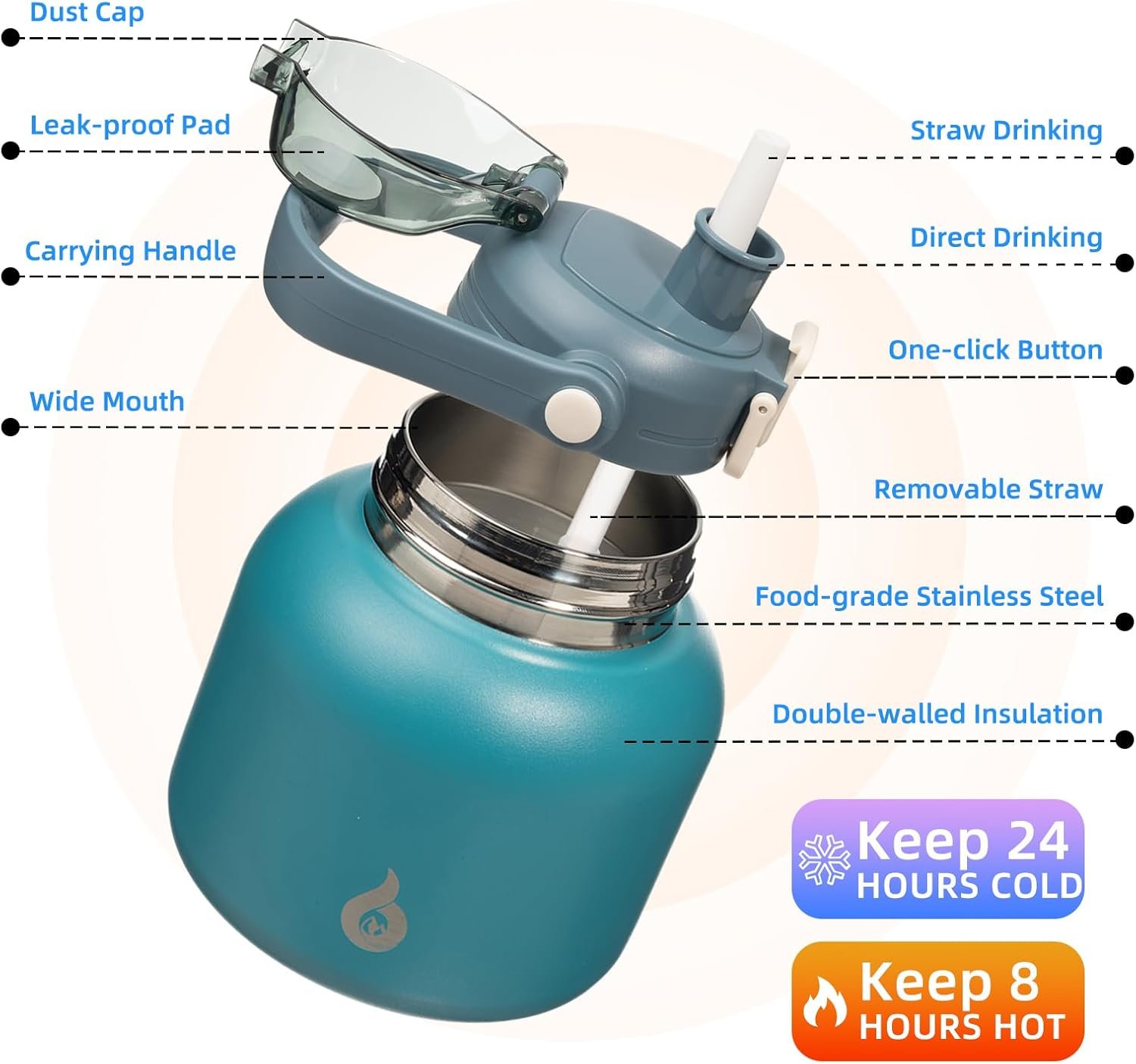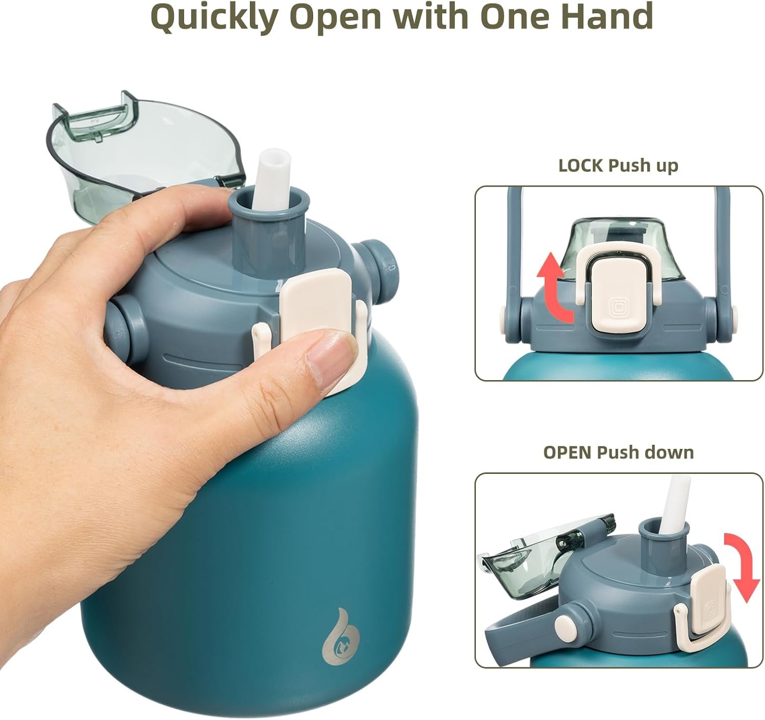 INSULATED WATER BOTTLE WITH ONE-CLICK OPENING LID: Just push the button with one hand, the straw will pop out automatically, our insulated water bottle with straw gives you an easier way to drink water. The straw is removable, you can enjoy sipping with straw or fast water flow without straw. This upgraded lid comes with a safety lock and dust-proof cap that ensures 100% leakproof and healthy daily water drinking