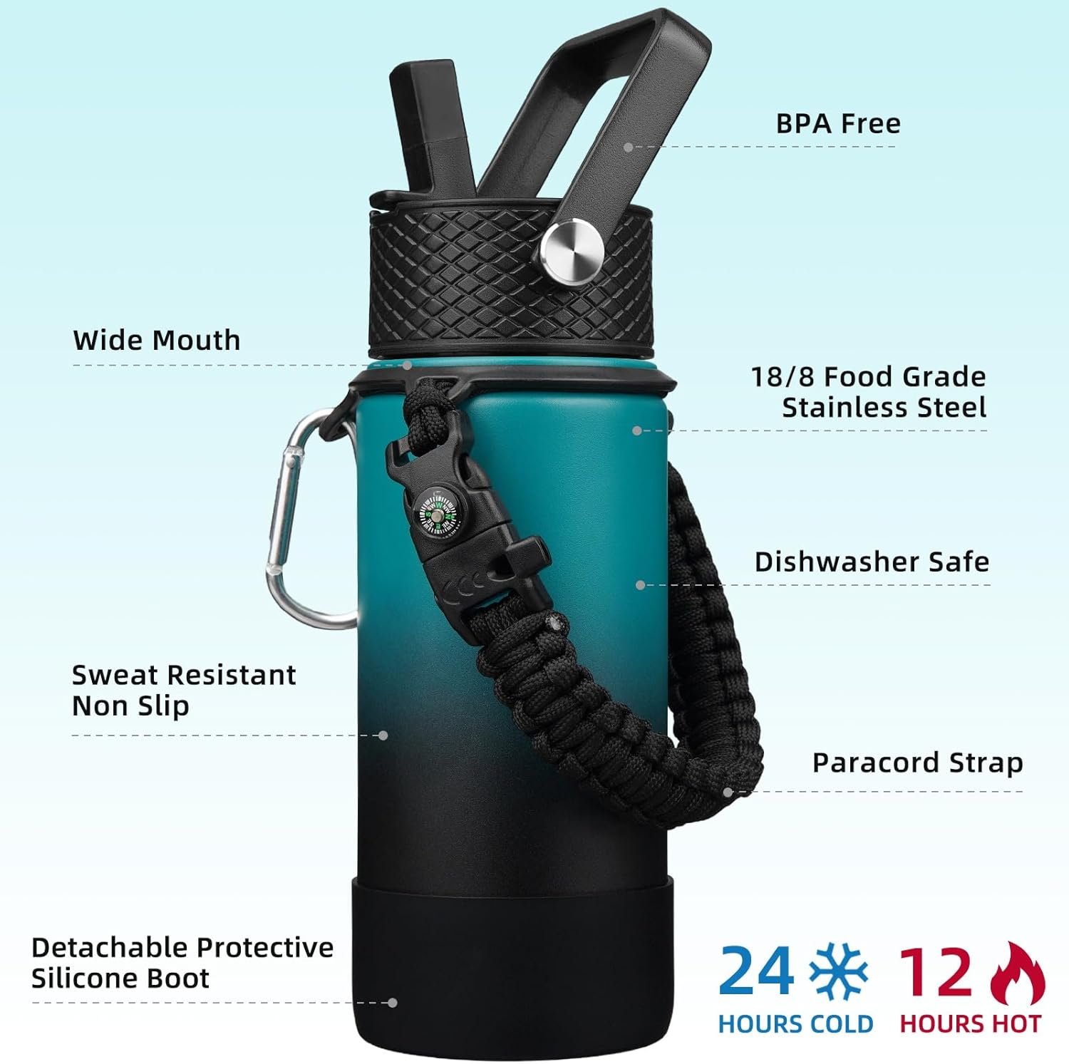 INSULATED WATER BOTTLE WITH A Full Pack: BJPKPK Vacuum Water Bottles have equipped a flip straw lid, an easy twist spout lid, and a portable handle lid to meet your needs in different scenarios. With a paracord handle, you can carry it in a comfortable and fashionable way. The detachable silicone boot can protect the bottom from bump damage. 2 straws,1 straw brush and dishwasher safe design help you clean it easilyv