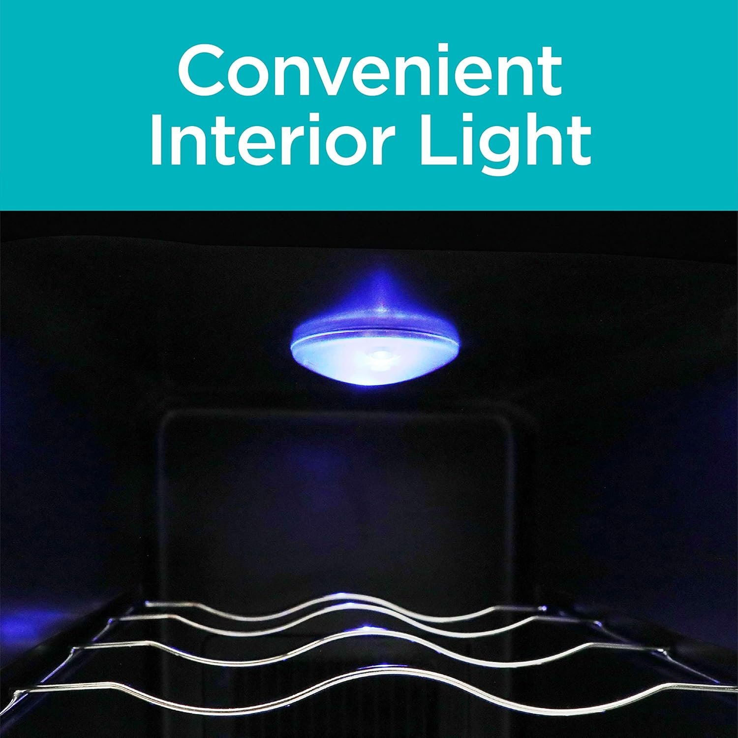 8 BOTTLE STORAGE: Store up to 8 bottles of your favorite vino with this 20.9-lb. space-saving small wine cellar. Our BLACK+DECKER small wine fridge (10.24″ x 20.1″ x 18.5″) also includes 3 chrome full-length racks and convenient interior light.