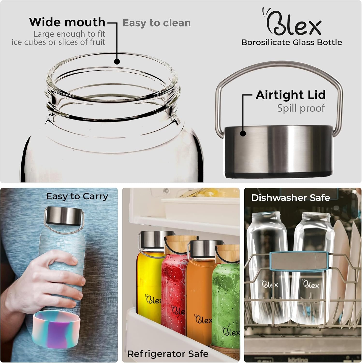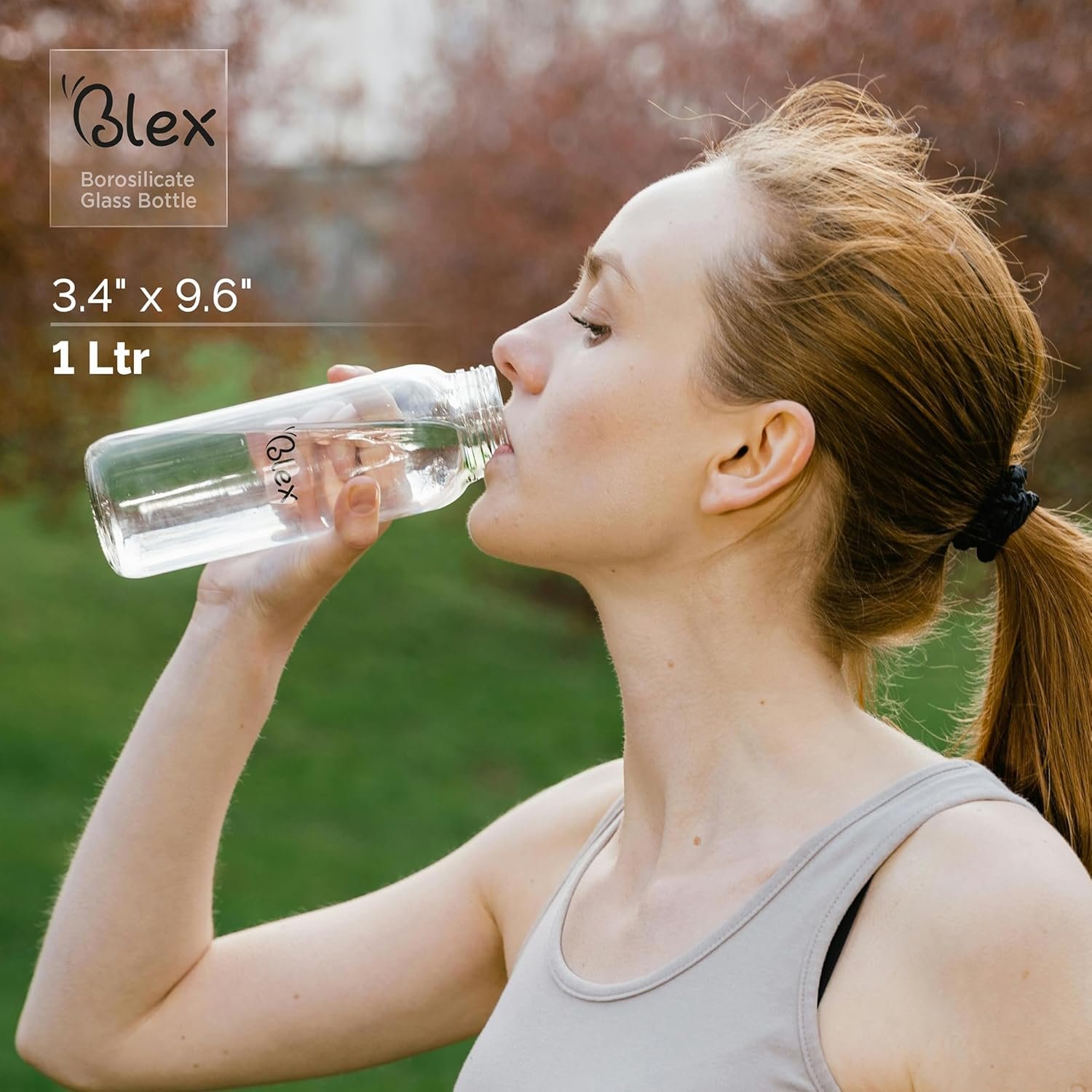 Blex 34 Oz Borosilicate Glass Water Bottle | Glass Bottle with Leak-Proof Steel Lid, Non-Slip Sleeve, Handle | BPA-Free, Non-Toxic, Thermal Stable, Perfect for Home, Gym, or Travel