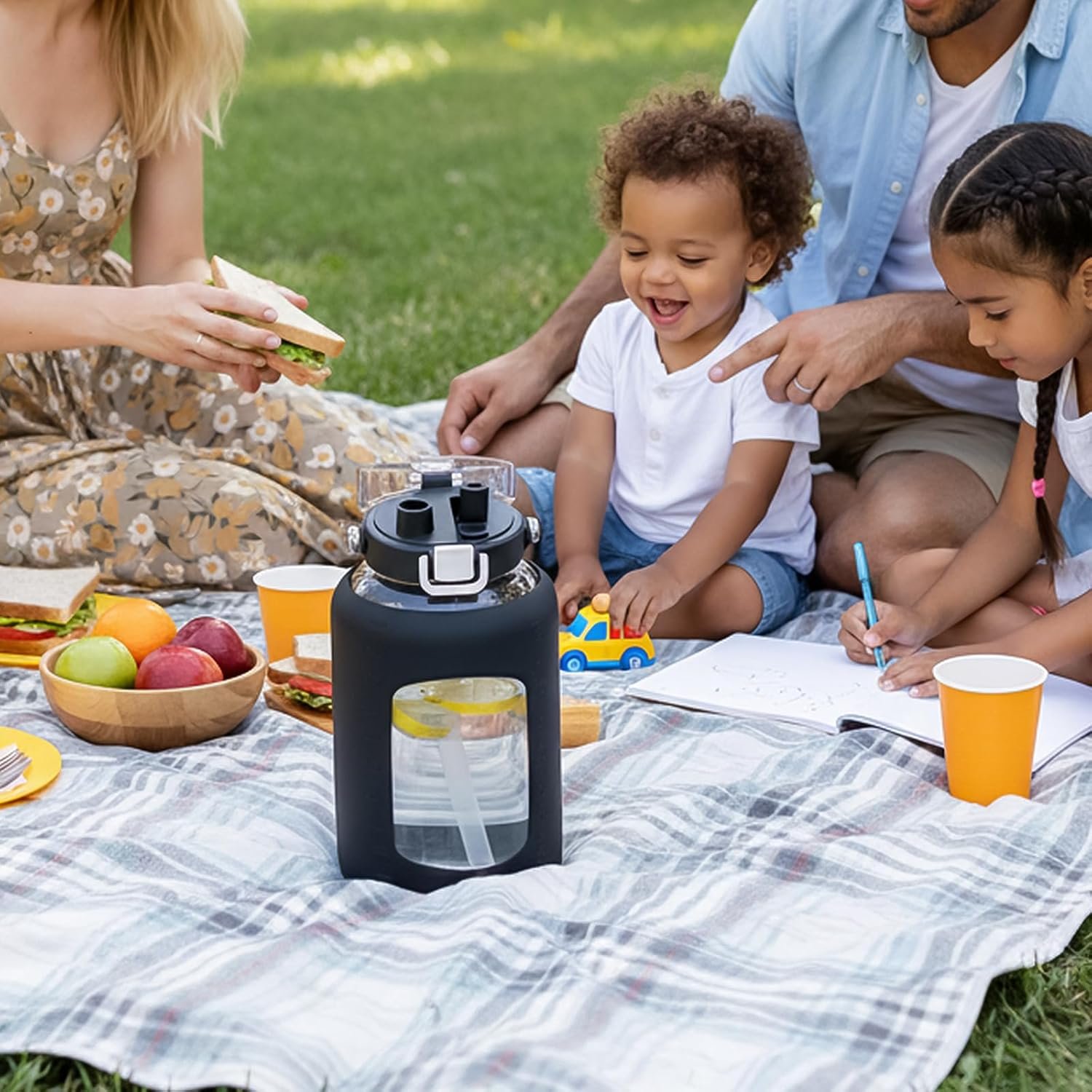 Silicone Sleeve with Time & Volume Markings to Keep You on Track – We believe a water bottle glass should do more than just hold water—it should actively help you build healthier habits. The protective sleeve does more than prevent breaks, it features time reminders and volume markings to visually guide your daily intake. Ideal for your home office, gym, or daily routine, this gallon water bottle is your partner in health.