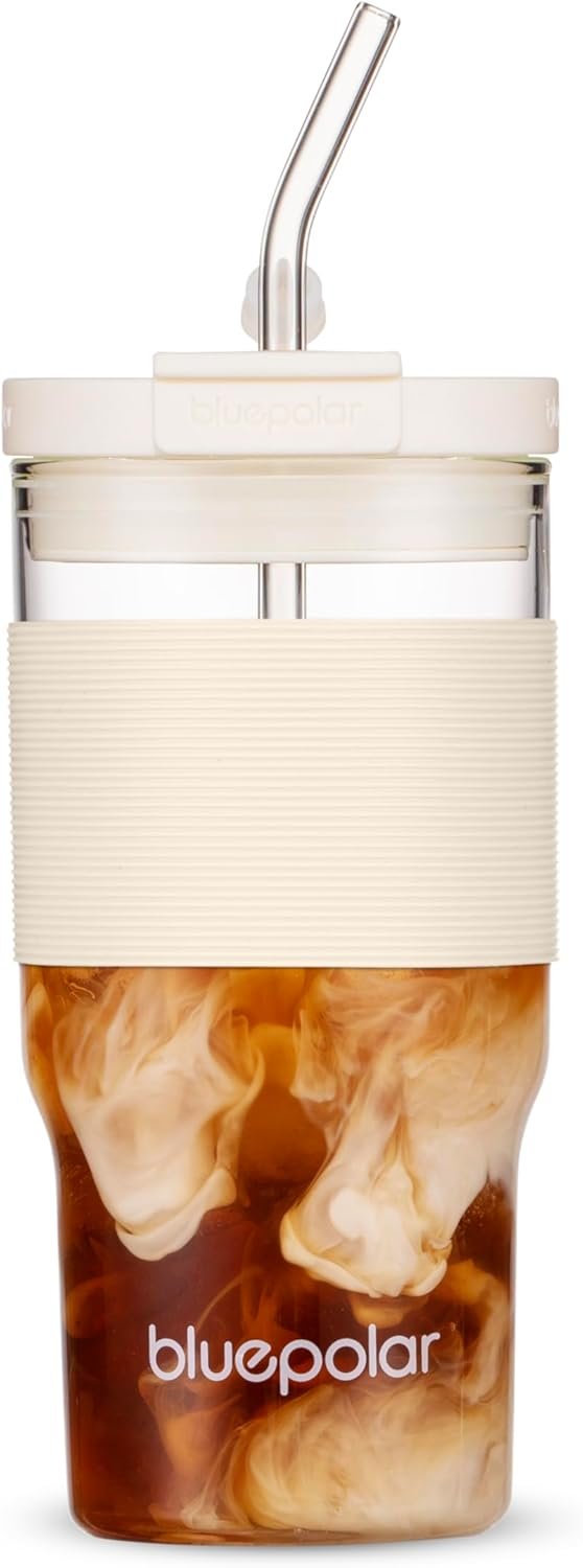 BLUEPOLAR 23oz/680ml Glass Tumbler with Straw and Lid – Leak-Proof Portable Travel Water Glass Cup for Smoothies, Iced Coffee,Matcha and Cold Beverages – Durable and Eco-Friendly (White with Sleeve)