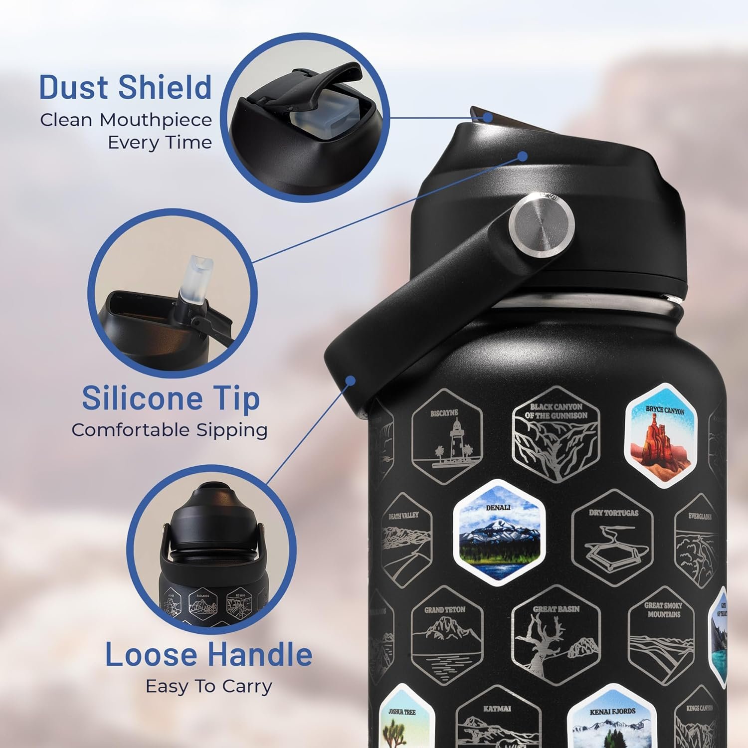 Premium 304 Food-Grade Stainless Steel: Inside & Outside resists rust and keeps your drinks safe.Leak Proof Lid with Straw: Our unique dust cover design keeps dirt off your straw and out of your mouth.Adventure-Ready Stickers: Waterproof Laminated Vinyl PVC Material + UV Resistant Ink + Permanent Adhesive = the most durable, weather resistant stickers on the market. (The BlueTrail National Park Water Bottle with stickers comes with all 63 color stickers of each National Park of the United States.)