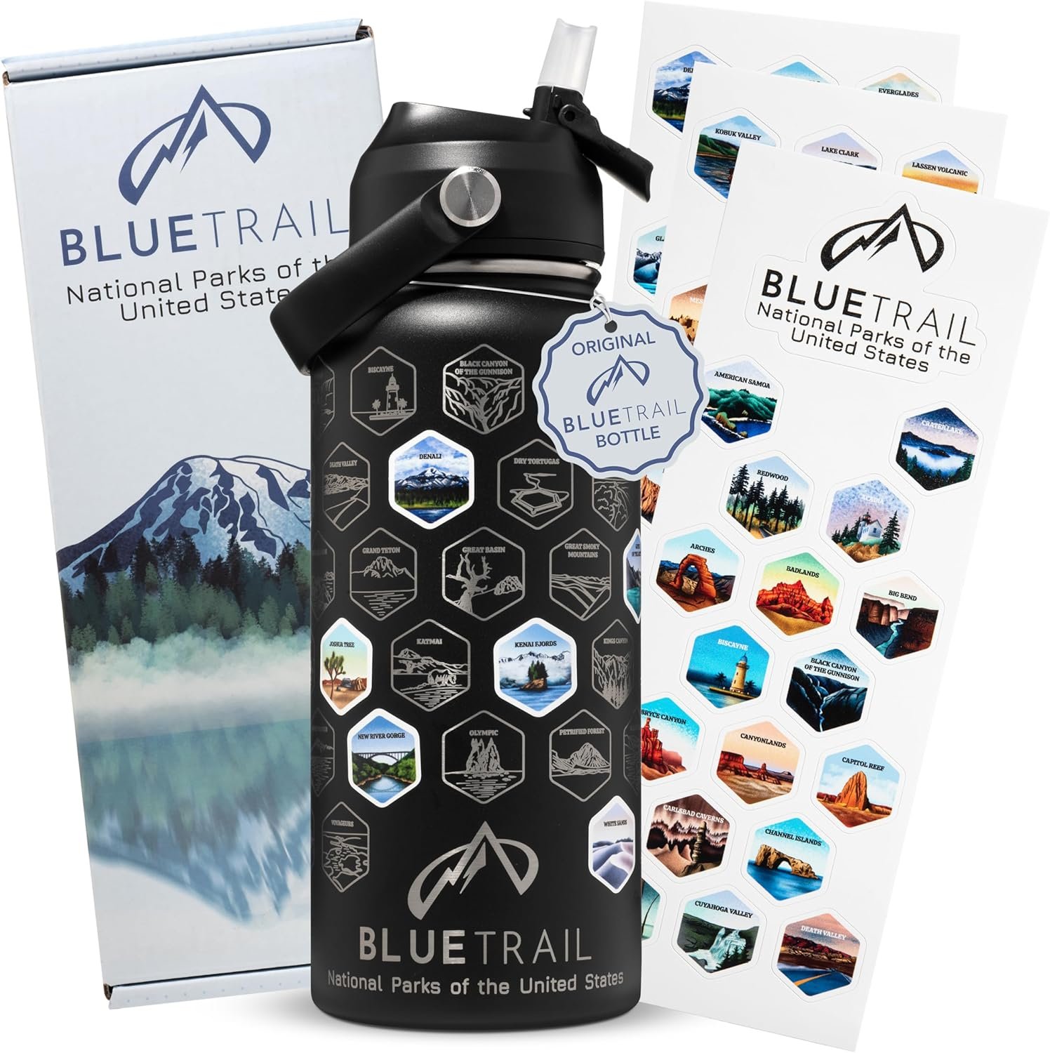 Discover the perfect blend of utility and tribute to America’s majestic national parks with the BlueTrail National Parks Water Bottle with Stickers.