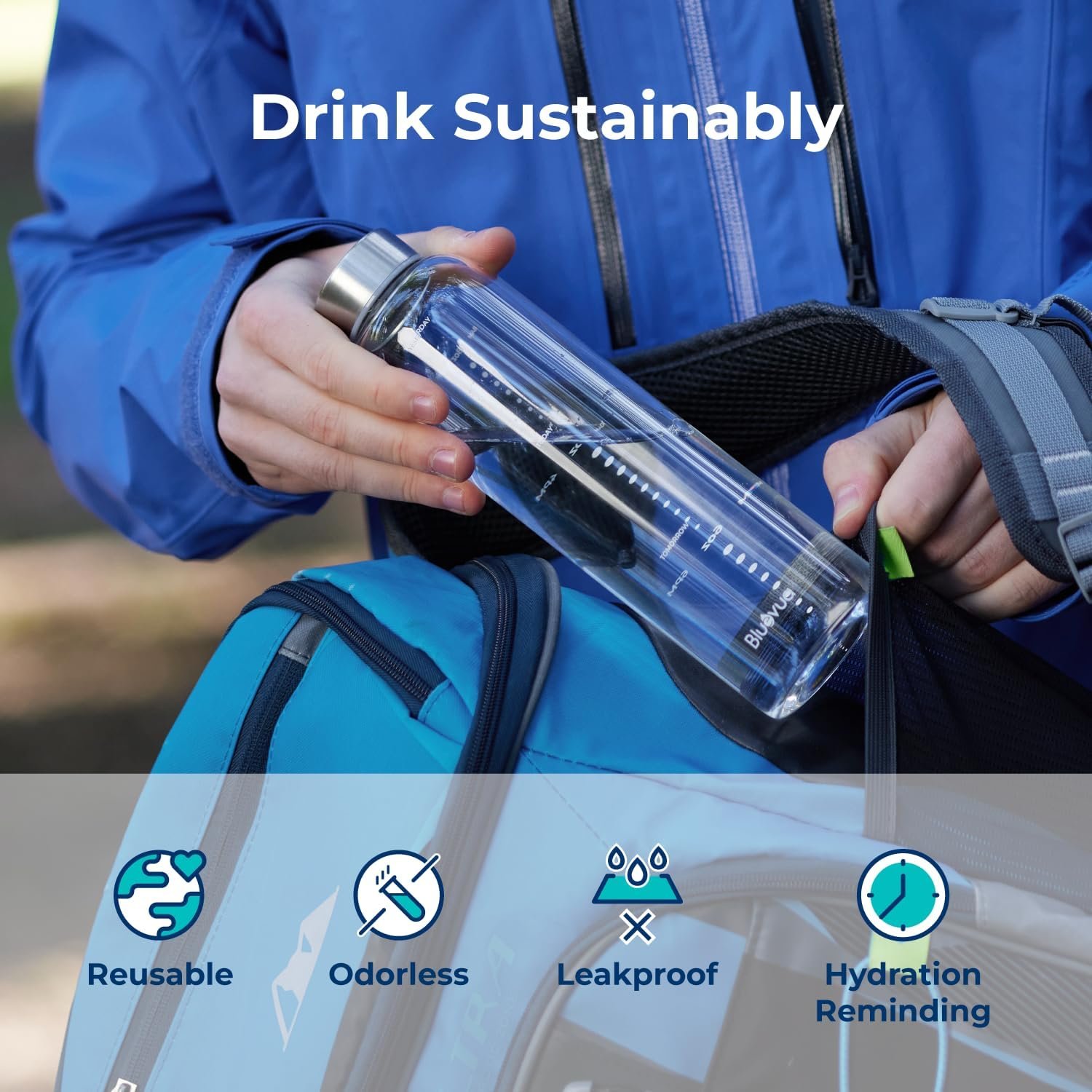 Bluevua Glass Water Bottle, 18 Oz High Borosilicate Glass with Time Marker, and Stainless Steel Leak Proof Lid, Compatible With RO100ROPOT-Travel Reverse Osmosis System